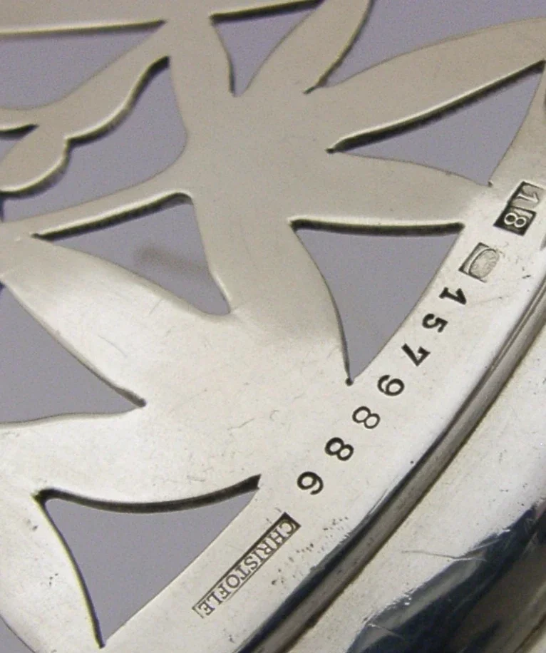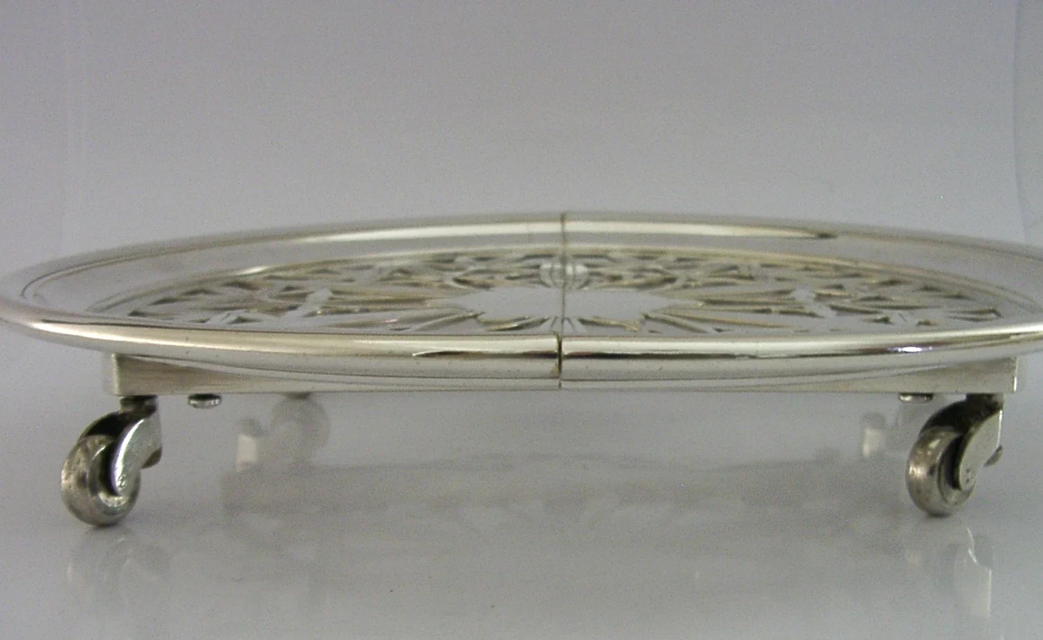A very nicely designed rare French silver plated hot serving dish stand. It is marked CHRISTOFLE along with design numbers, I would date it to the late Art Nouveau early Art Deco era c1910-1920's. It has been beautifully made being supported on castors allowing it to be moved along a table and it extends to accommodate larger dishes and platters. It is in superb condition being free from dings splits distortions wear and repairs. It measures a touch under 9.5 inches (14cms) wide 13.75 inches fully extended and weighs 760 grams. A very nicely designed rare piece.