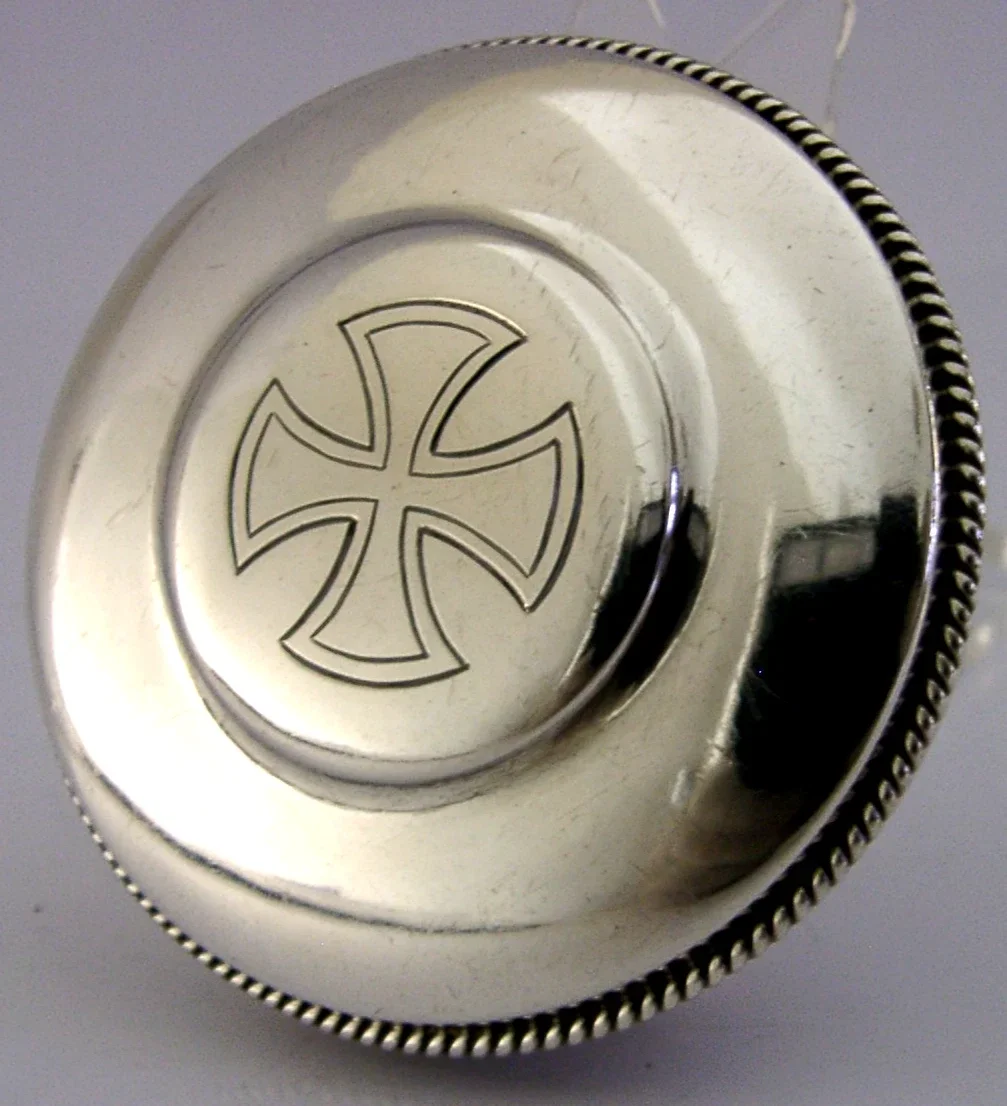 A beautifully large English solid sterling silver pyx or wafer box. It is hallmarked for London 1962 with the makers mark being AS. It is has been superbly designed being engraved with a cross and the inside being gilded. It is in superb condition being free from dings splits holes and repairs, the lid is loose fitting so more for a table than to be carried around. It measures approx. 2.5 inches (6.3cm) across by over 1 inch (2.7cm) tall and weighs 64 grams. A very nice quality piece.
