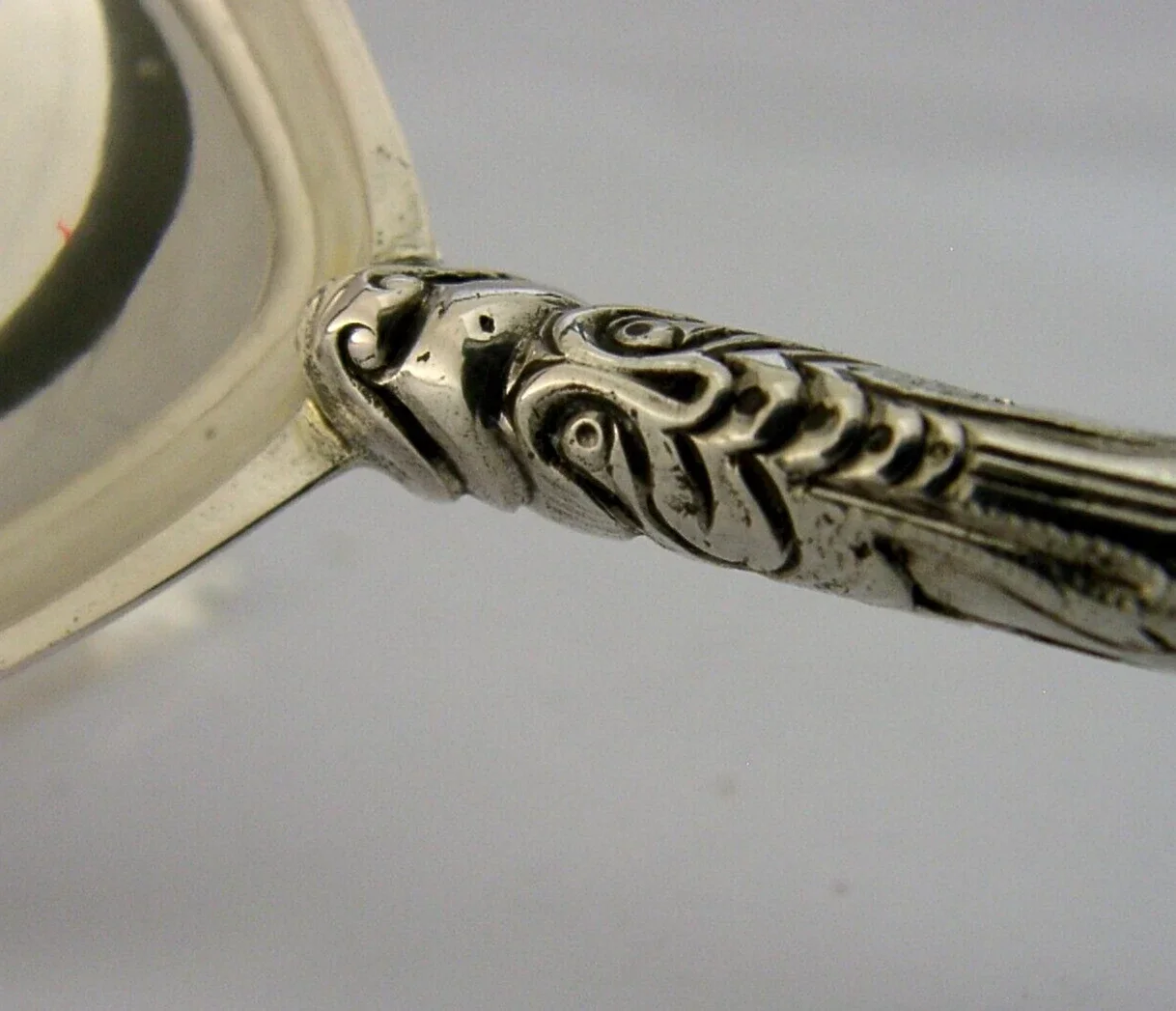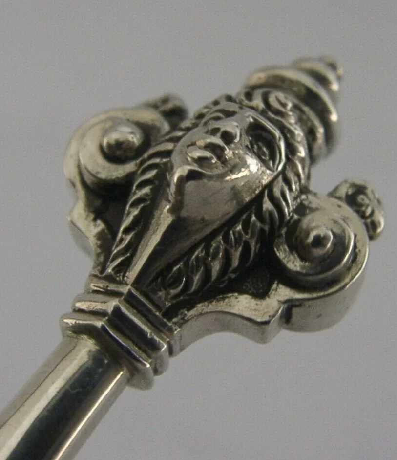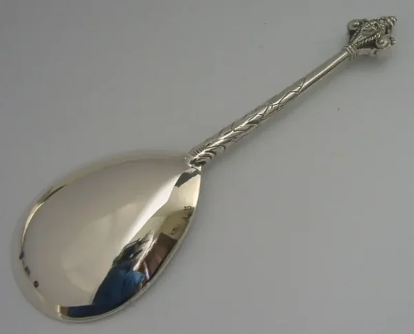 A beautiful Danish antique solid sterling silver baptism spoon. It is hallmarked with the three towers mark and date code 85 for 1885. It has been beautifully designed having a broad bowl and ornate terminal depicting faces. It is in super condition being free from dings splits distortions and repairs. It measures approx. 6.25 inches (15.7cm) long by 2 inches (5.1cm) wide and weighs 61 grams. A beautifully made piece.