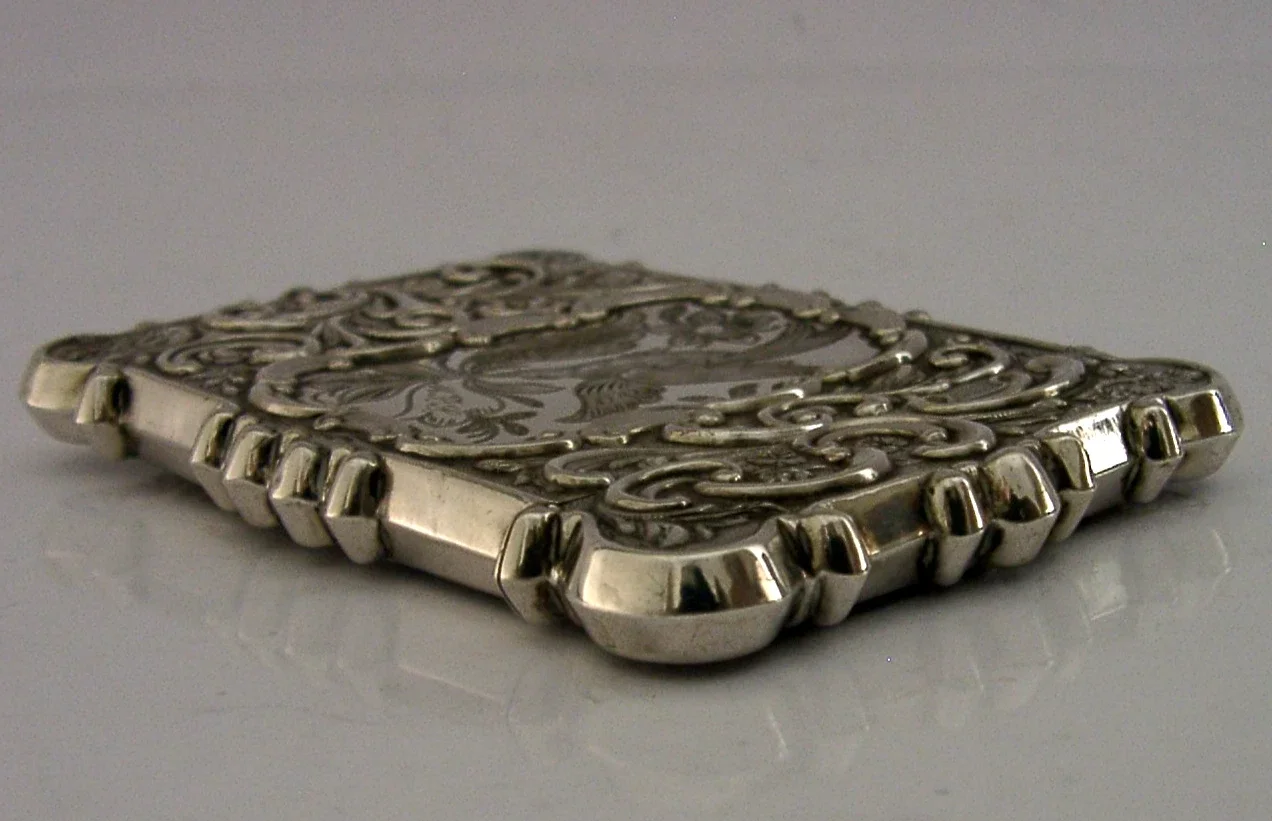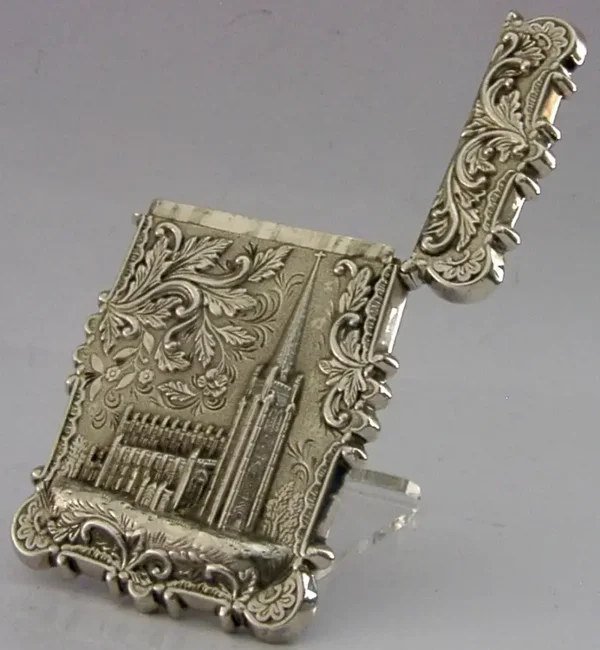 RARE AMERICAN STERLING SILVER TRINITY CHURCH CASTLE TOP CARD CASE c1850 ANTIQUE