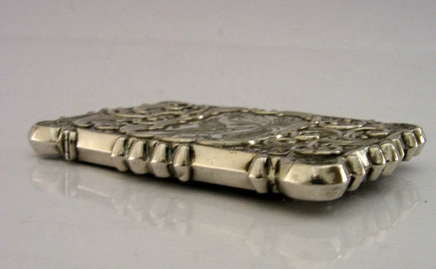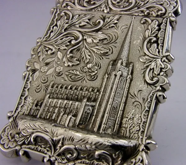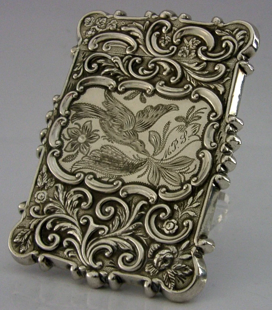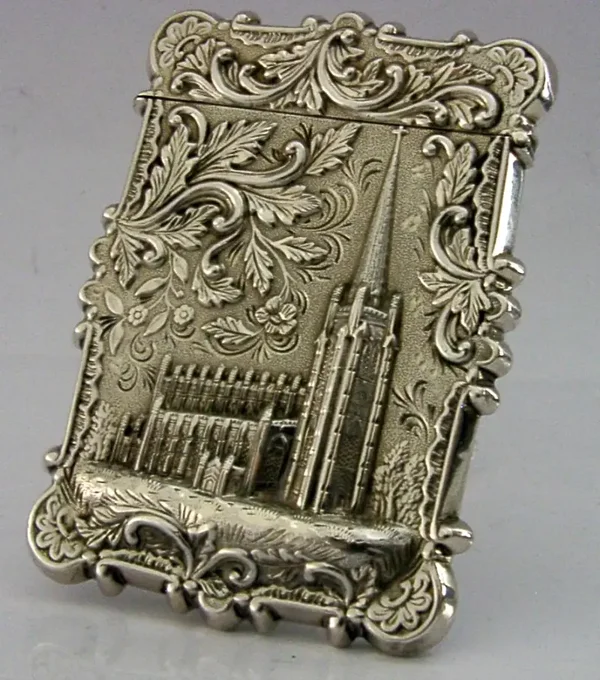 A beautiful American solid silver Trinity Church New York castle top card case. It is unmarked but tests as high grade silver. I would date it to c1850 possibly sold as an early souvenir piece not long after the church was completed. It has been superbly made with one side depicting Trinity Church the other a bird and the engraved initials MPS. It is in superb condition being free from dings, splits, holes and repairs. It measures approx. 3.5 inches (8.8cm) long by 2.5 inches (6.2cm) wide and weighs 46 grams. A beautifully designed high quality example.