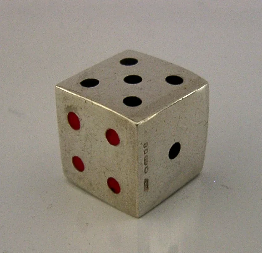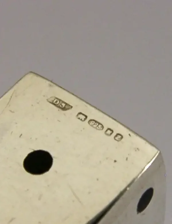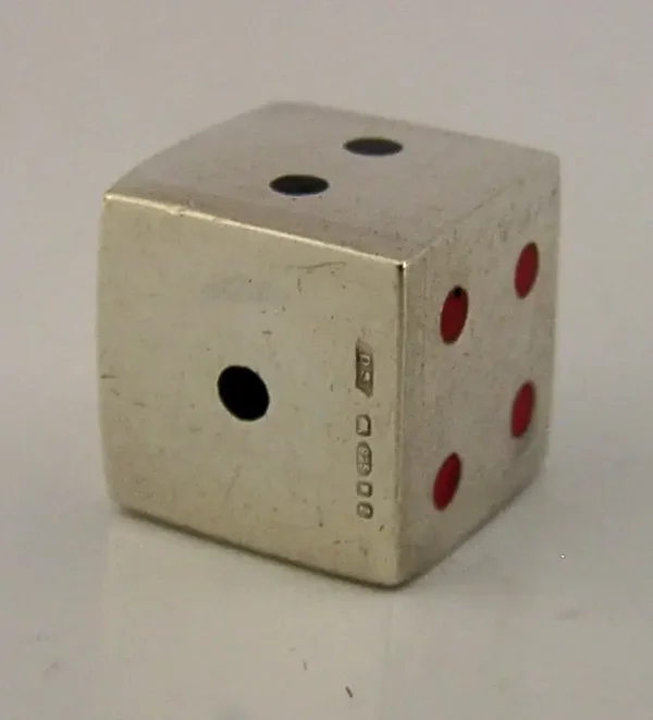 A superb English solid sterling silver and enamelled dice. It is hallmarked for London 1999 with the maker being DS. It has been well made and all the enamelled dots are complete. It is in superb condition being free from dings splits chips cracks and repairs. It measures approx. 0.5 inches (1.3cm) square and weighs 8 grams. A quality piece.