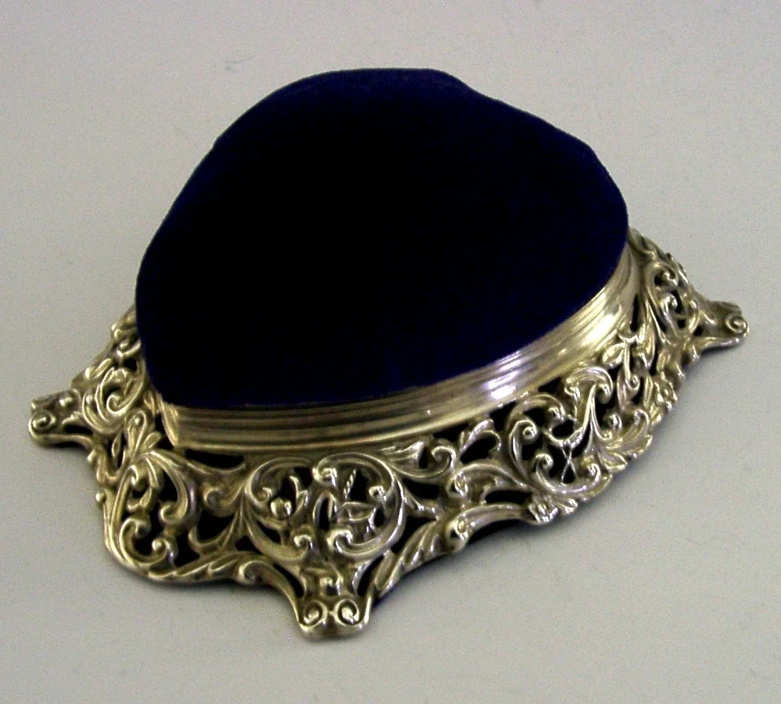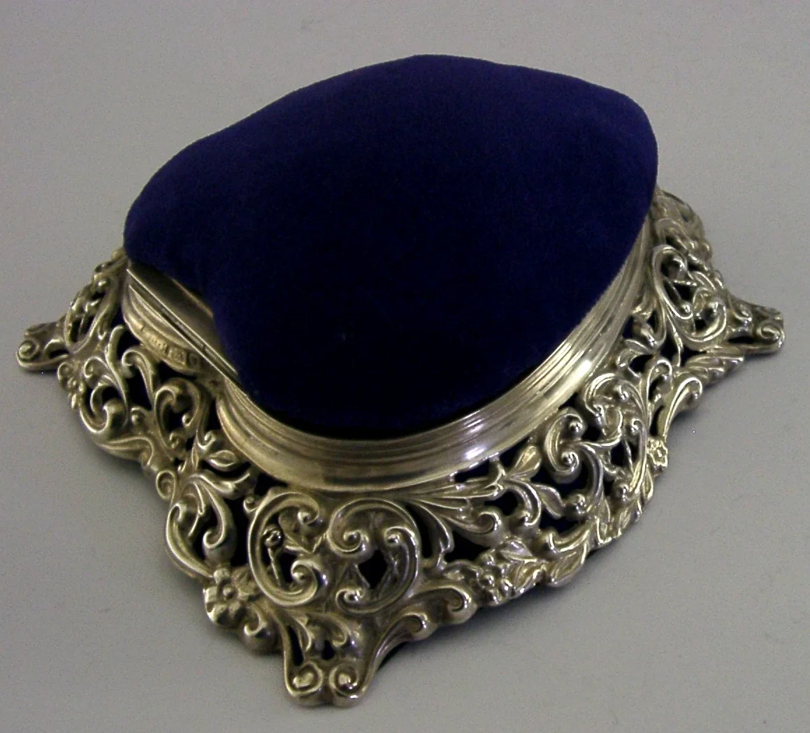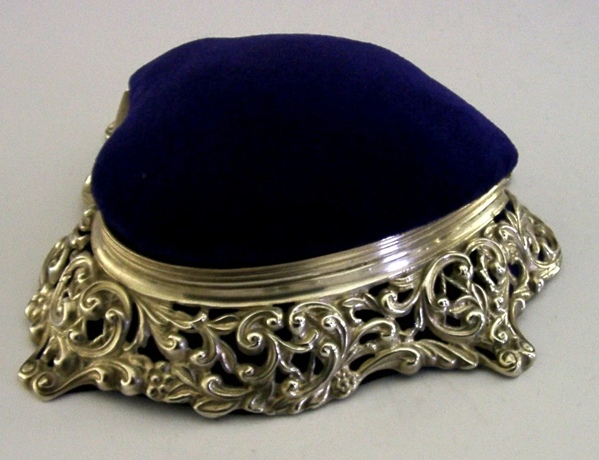 A rare good sized English Victorian antique solid sterling silver combination jewellery and pin cushion (for hat and stick pins etc...). It is hallmarked for Birmingham 1895 with the maker being Henry Matthews. It has been superbly designed being in a love heart form. It is in super condition being free from dings splits holes and repairs, professionally relined and covered. It measures approx. 4 inches (10.2cm) across by 4.75 inches (12cm) front to back by 2 inches (5cm) tall and weighs 152 grams. A very high quality example.