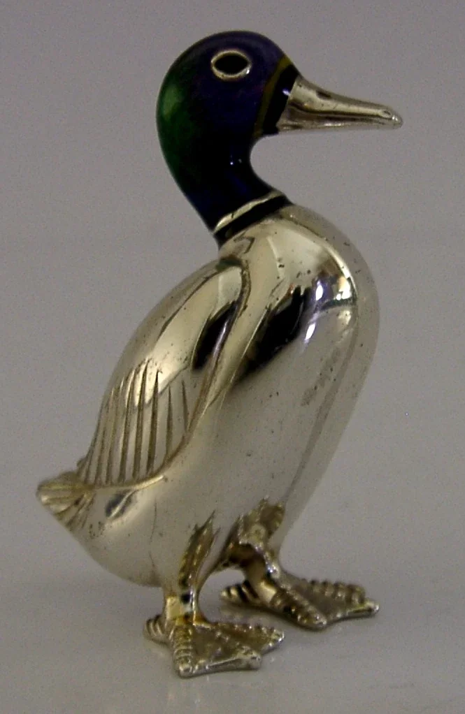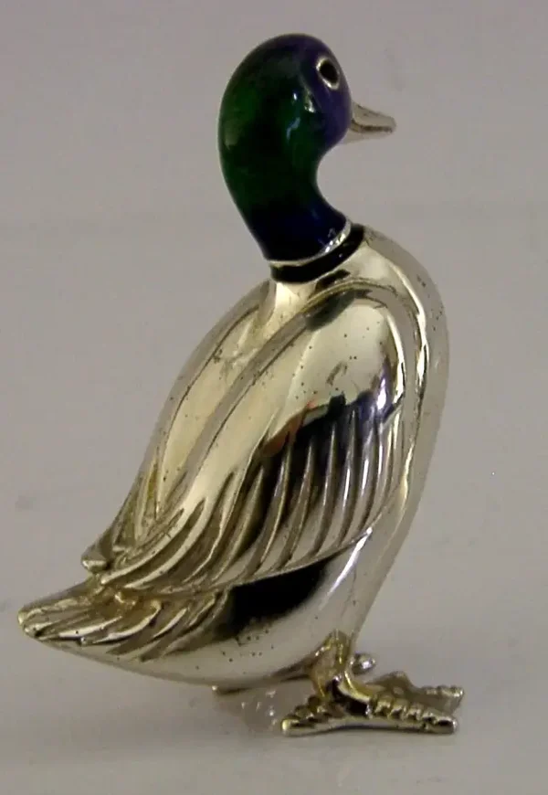 A superbly modelled decent sized sterling silver bird figure. It is hallmarked for London 2001 with the maker marks being CJI, there are also Italian marks. It has been beautifully modelled in the form of a duck. It is in super condition being free from dings splits chip cracks and repairs. It measures approx. 2 inches (4.8cm) tall and weighs 26 grams. A very pretty piece.