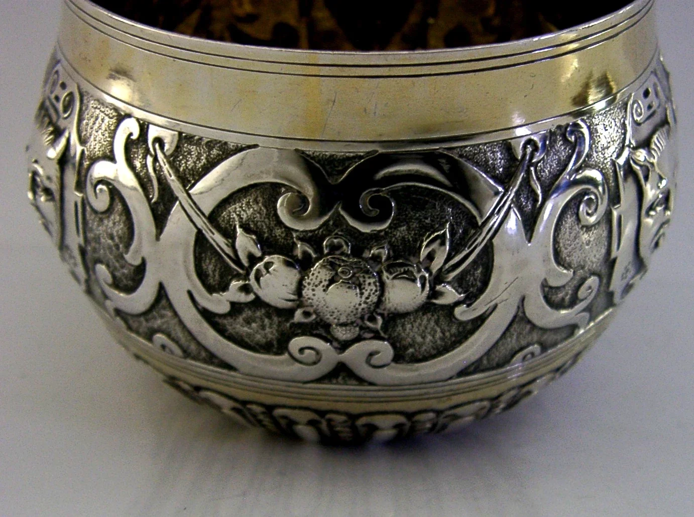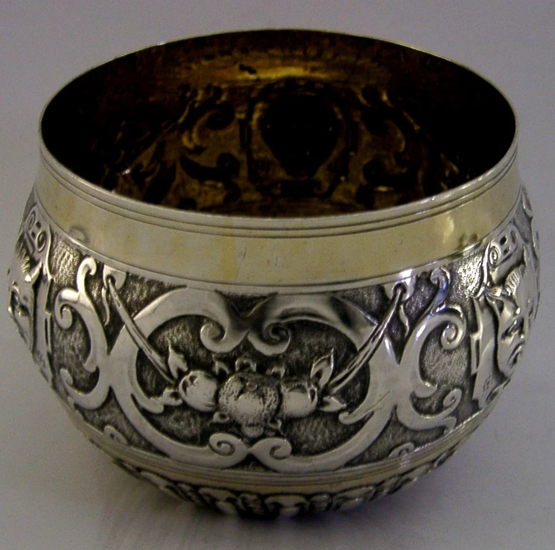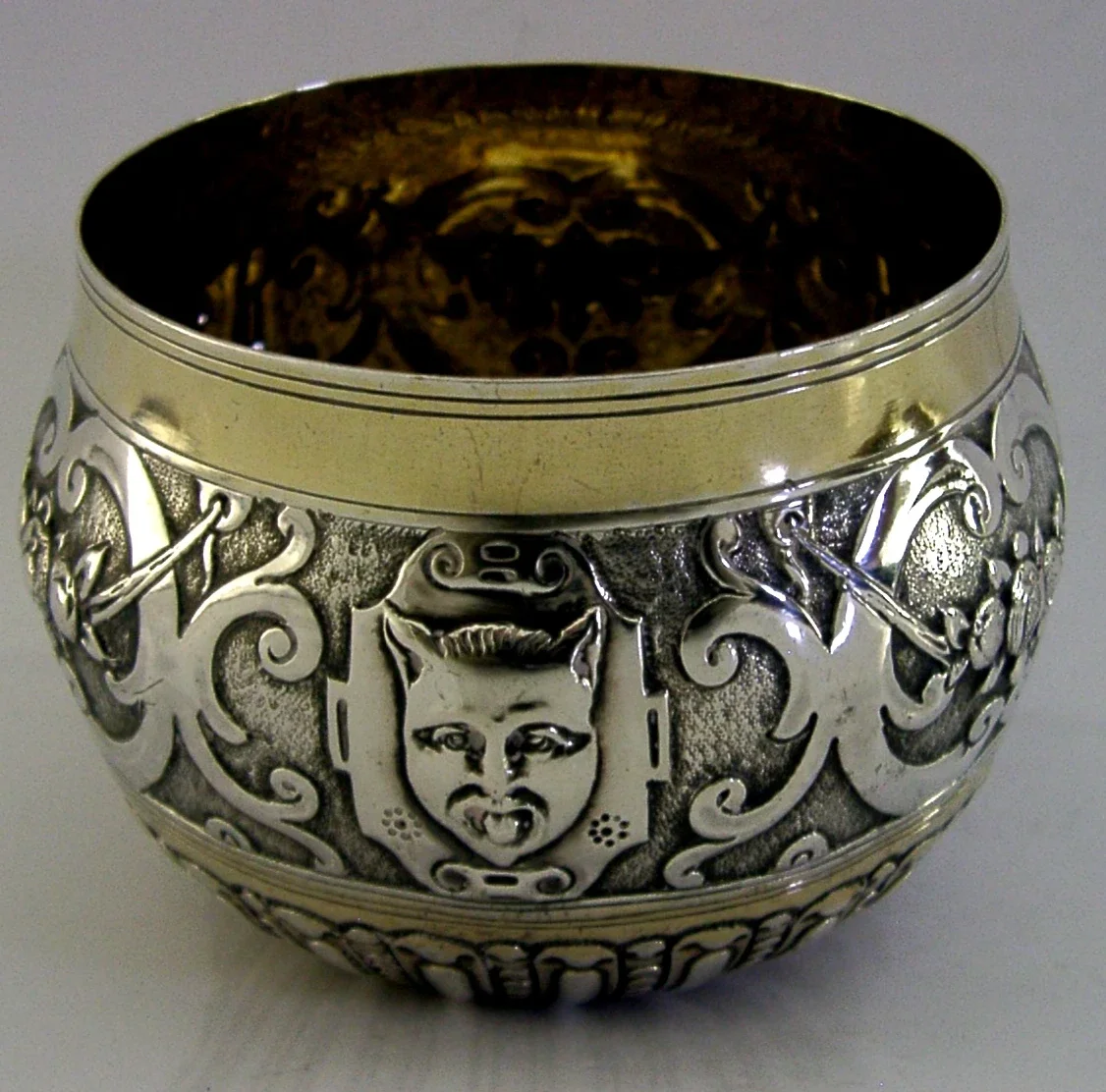 A strange and very unusual sterling silver cup / bowl. It is unmarked but tests as sterling silver - I would date it to c1880 most likely commissioned. It has been unusually designed incorporating three images possibly all representing different images of the Devil, between these are fruit (possibly symbolising the forbidden fruit of the Garde of Eden). The rim and inside has been gilded the base set with a Queen Anne silver coin dating to c1702-1714. It is in superb condition having no dings splits holes or repairs. It measures approx. 3.25 inches (9cm) across by 2.5 inches tall and weighs 166 grams. A very interesting possibly occult piece.