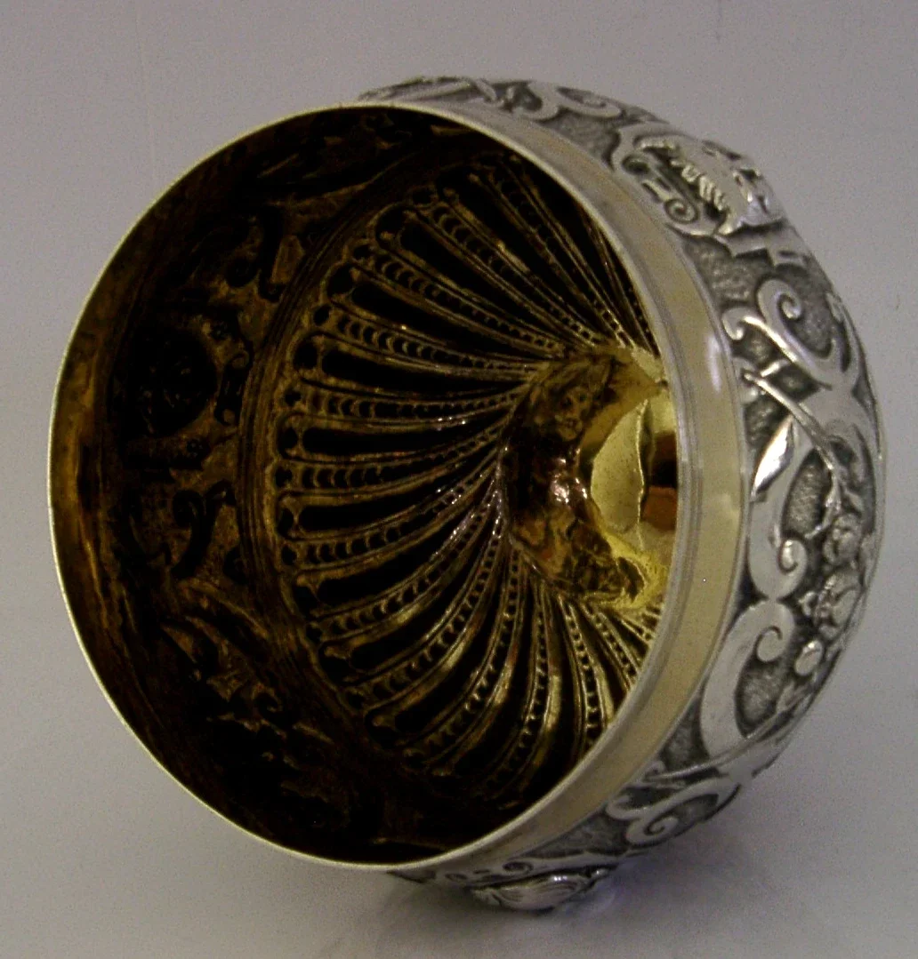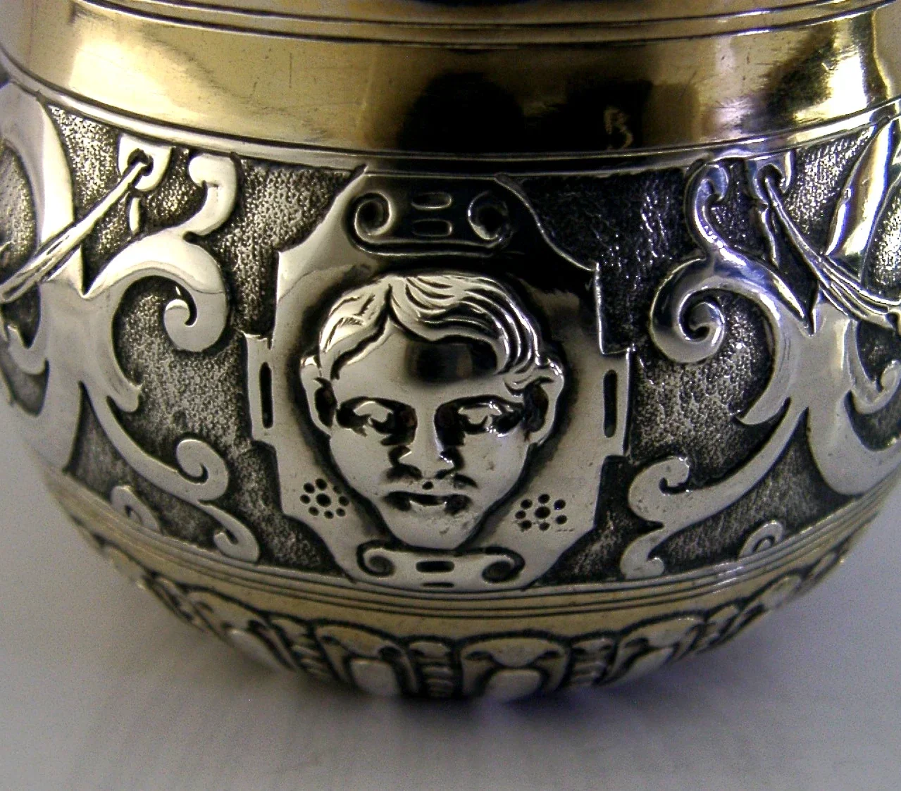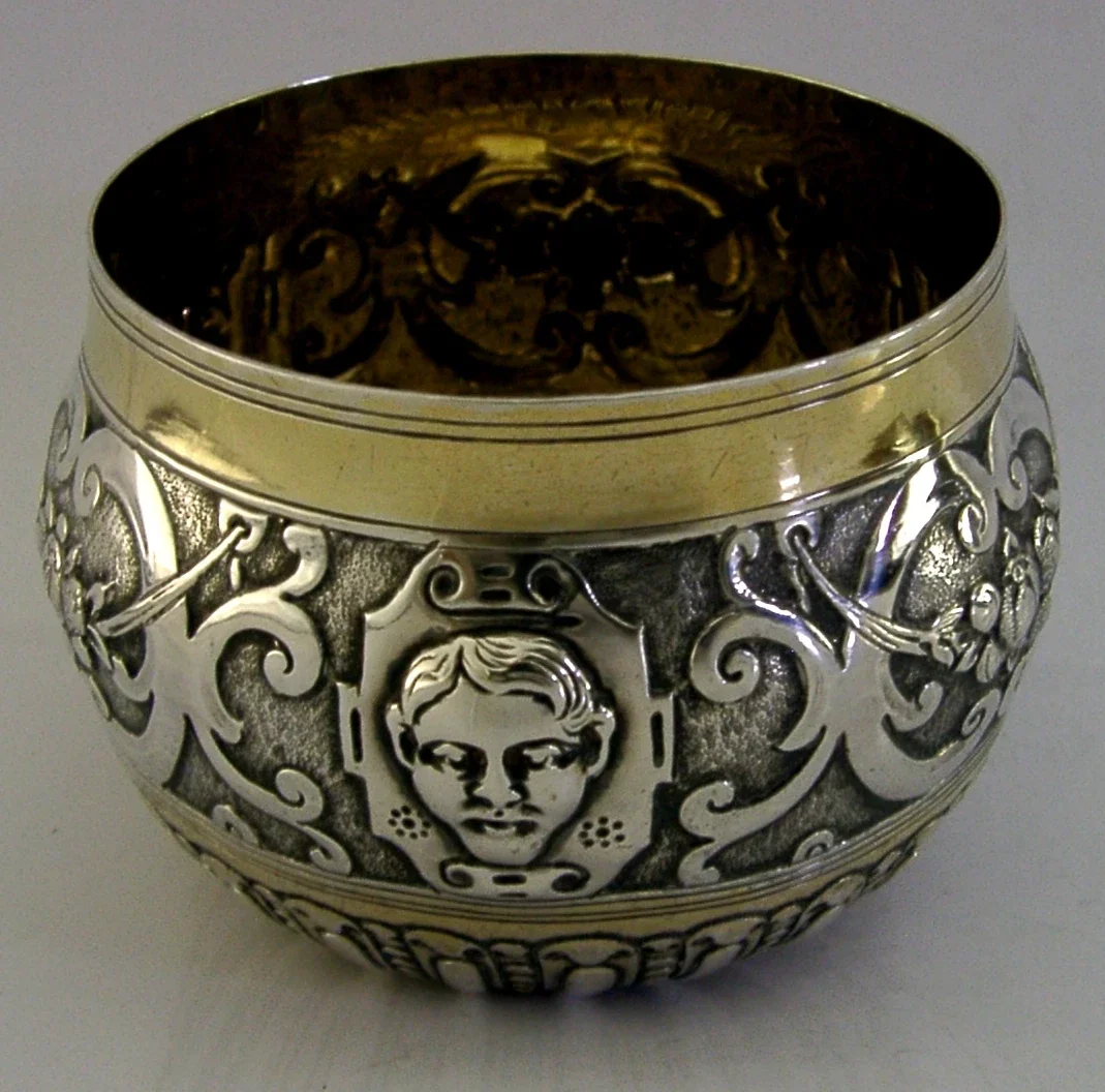 A strange and very unusual sterling silver cup / bowl. It is unmarked but tests as sterling silver - I would date it to c1880 most likely commissioned. It has been unusually designed incorporating three images possibly all representing different images of the Devil, between these are fruit (possibly symbolising the forbidden fruit of the Garde of Eden). The rim and inside has been gilded the base set with a Queen Anne silver coin dating to c1702-1714. It is in superb condition having no dings splits holes or repairs. It measures approx. 3.25 inches (9cm) across by 2.5 inches tall and weighs 166 grams. A very interesting possibly occult piece.