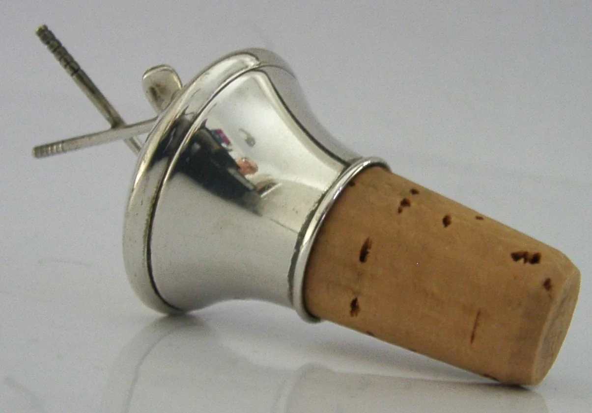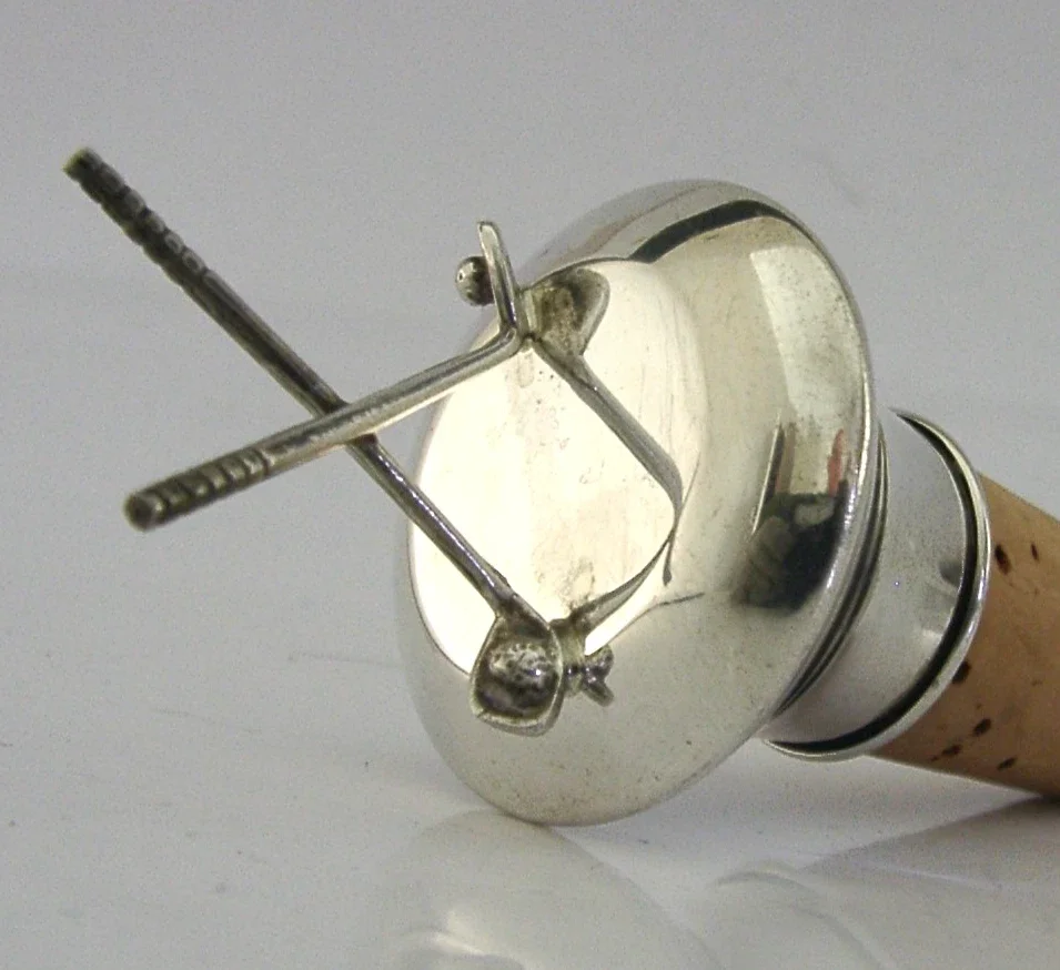 A very nice quality English solid sterling silver bottle stopper. It is hallmarked for Birmingham 1995 with the maker being A J Poole. It has been superbly designed with the terminal being in the form of crossed golf clubs. It is in super condition being free from dings splits distortions and repairs. It measures approx. 3.5 inches (8.8cm) tall including the cork by 1.5 inches (3.8cm) wide and weighs 34 grams. A very nicely designed piece.