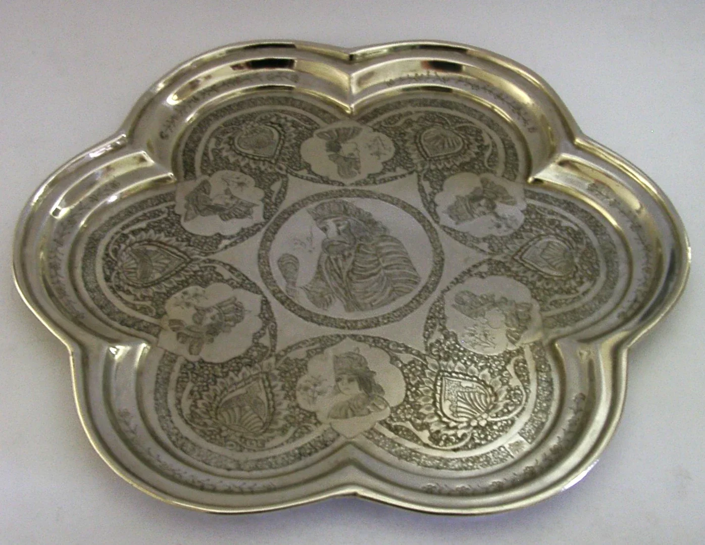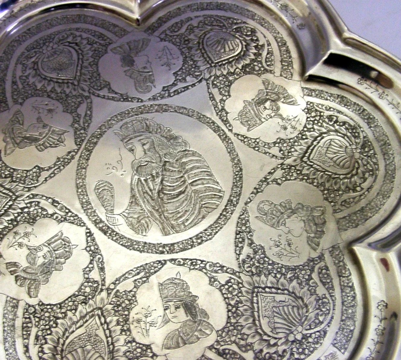 A stunning Persian / Ottoman antique solid silver salver tray. It is hallmarked and test as high grade silver - 840 standard. I would date it to c1920. It has been beautifully hand made and chased with various scenes and signed. It is in superb condition being free from dings splits holes and repairs. It measures approx. 13.5 inches (34.4cm) across and weighs 752 grams. A very high quality interesting piece.