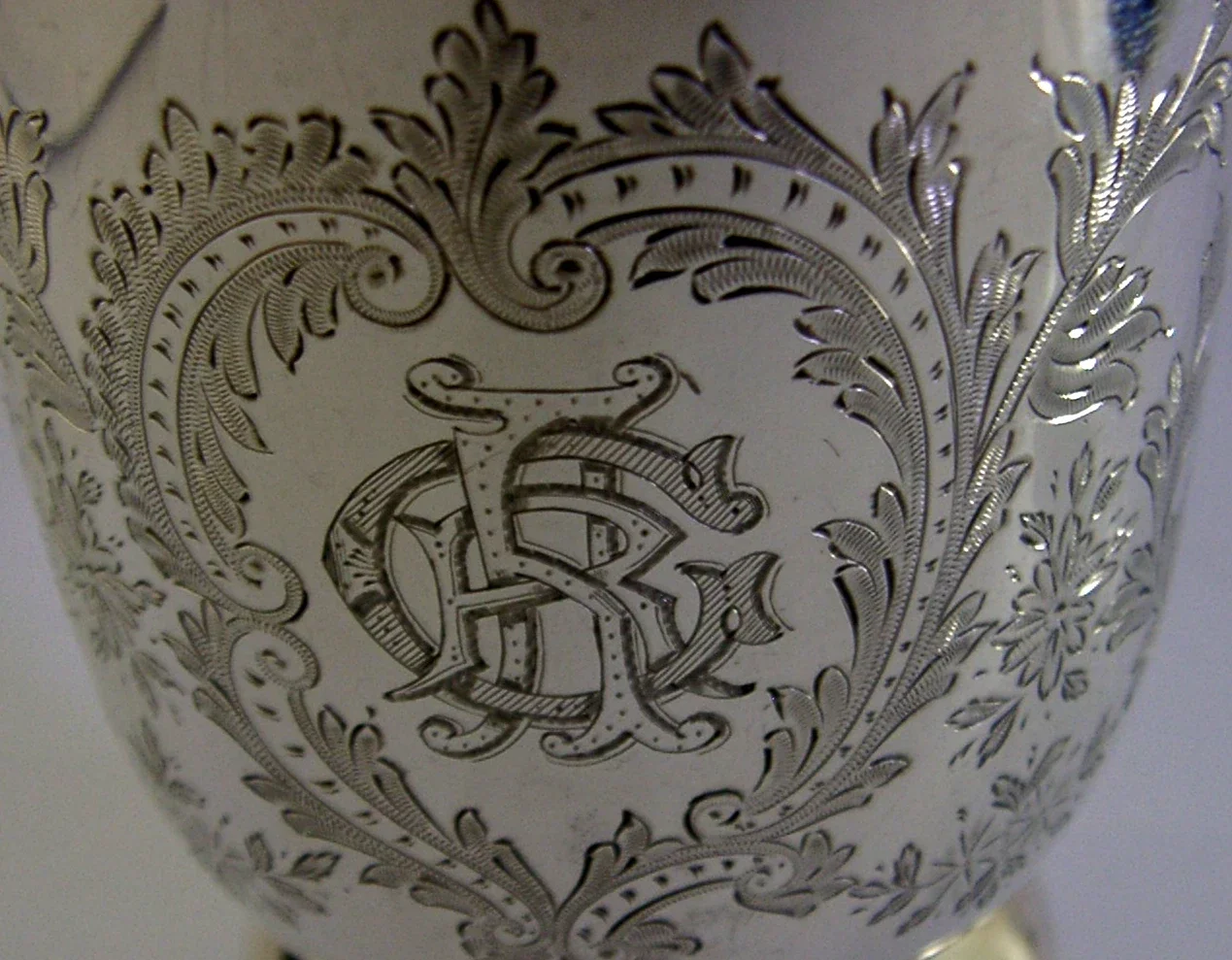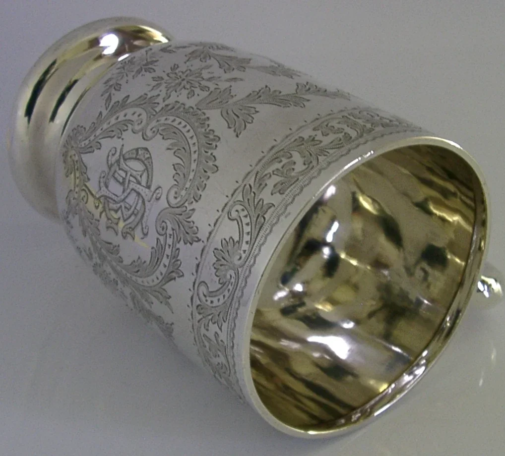 A quality English solid sterling silver pint tankard. It is hallmarked for Birmingham 1896 with the maker being Heath and Middleton. It has been superbly made being engraved with scrolls leaves and the initials CAR RCA RAC ARC etc... as they are entwined. It is in superb condition being free from dings splits holes distortions and repairs, the dovetailed joining seem is slightly visible down the back from when it was made, I suspect it would have been gilded inside which would have covered this, it could be easily re-gilded. It measures approx. 5 inches (12.2cm) tall by 4.75 inches (11.4cm) across including the handle and weighs 246 grams. A top quality piece.