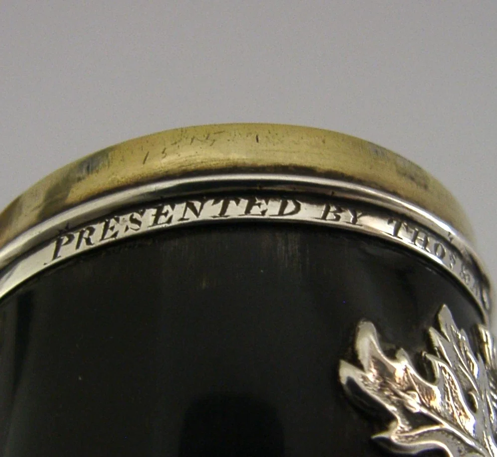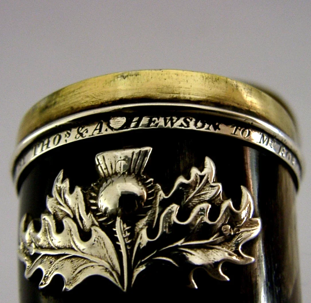 A beautiful fascinating and rare Scottish sterling silver and horn snuff mull. It is unmarked as is common but tests as high grade silver. It has been beautifully set with pink quartz, gilded inside, and most interestingly engraved 'PRESTENTED BY THOMAS & A HEWSON TO MR ROBERT GEE 1826'. I was told it belong to a prominent Liverpool MD and social reformer - below are details I believe relate to it. It appears Thomas Hewson was a surgeon during Georgian / Victorian times having studied medicine at University College London (and living in the area) where it appears Robert Gee (c1806-1891) had come to study, hence where they most likely met - Gee would have been about 20 at the time this was present possibly and appropriately around the time he graduated and may have left for further study in Edinburgh? Gee eventually settle in Liverpool where he wrote numerous papers and campaigned to improve conditions in the workhouses. It is in outstanding condition, (almost as new). It measures approx. 3.5 inches (8.8cm) long by 1.75 inches (4.2cm) wide and weighs 72 grams. A very high quality fascinating piece.