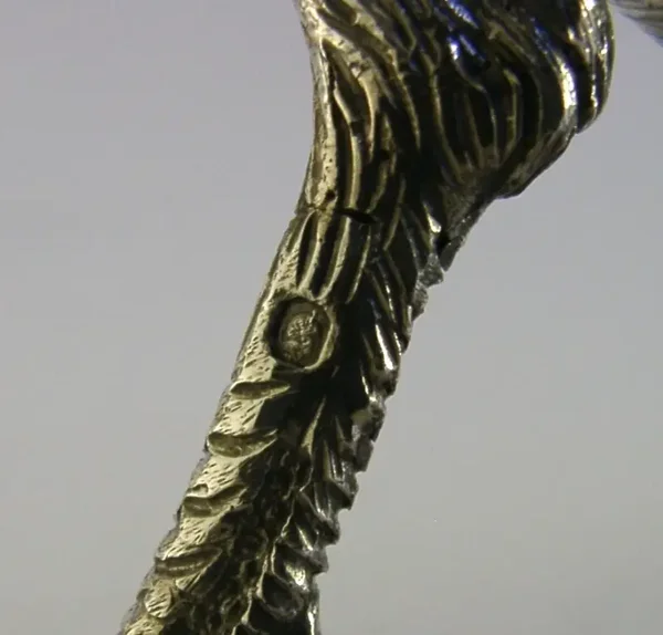 A rare huge superbly modelled French sterling silver desk or table bird figure. It is hallmarked with the French 950 Minerva Head along with a makers mark, I would date it to c1920s. It has been beautifully modelled in the form of a rooster. It is in super condition being free from dings splits and repairs. Some tail feathers are a little bent and one leg has a partial crack where the hallmark has been struck but it is still strong - see photo. It measures approx. 10.25 inches (26cm) long beak to tail by 7.5 inches (19cm) wide by 8 inches (20.2cm) tall to the top of its tail feathers and weighs 854 grams (all silver not filled or weighted). A very well designed high quality example.
