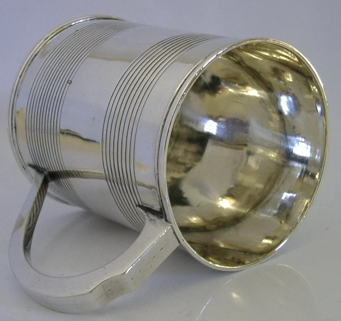 A very historic Georgian English solid sterling silver military pint tankard. It is hallmarked for London 1829 with the makers marks being WB. It has been superbly made being engraved with the insignia of the Rifle Brigade and interestingly, 'To the Officers of the 2nd Battalion Rifle Brigade by the owner of Gramont'. I suspect this is Grammont Belgium which was an important staging post prior to the Battle of Waterloo? - I wonder if the 'owner' was the local lord who accommodated troops for months prior to the battle or maybe the commanding officer? It is in superb condition being free from dings splits holes distortions and repairs. It measures over 4 inches (10.2cm) tall by 5 inches across including the handle and weighs 318 grams. A fascinating piece of military history.