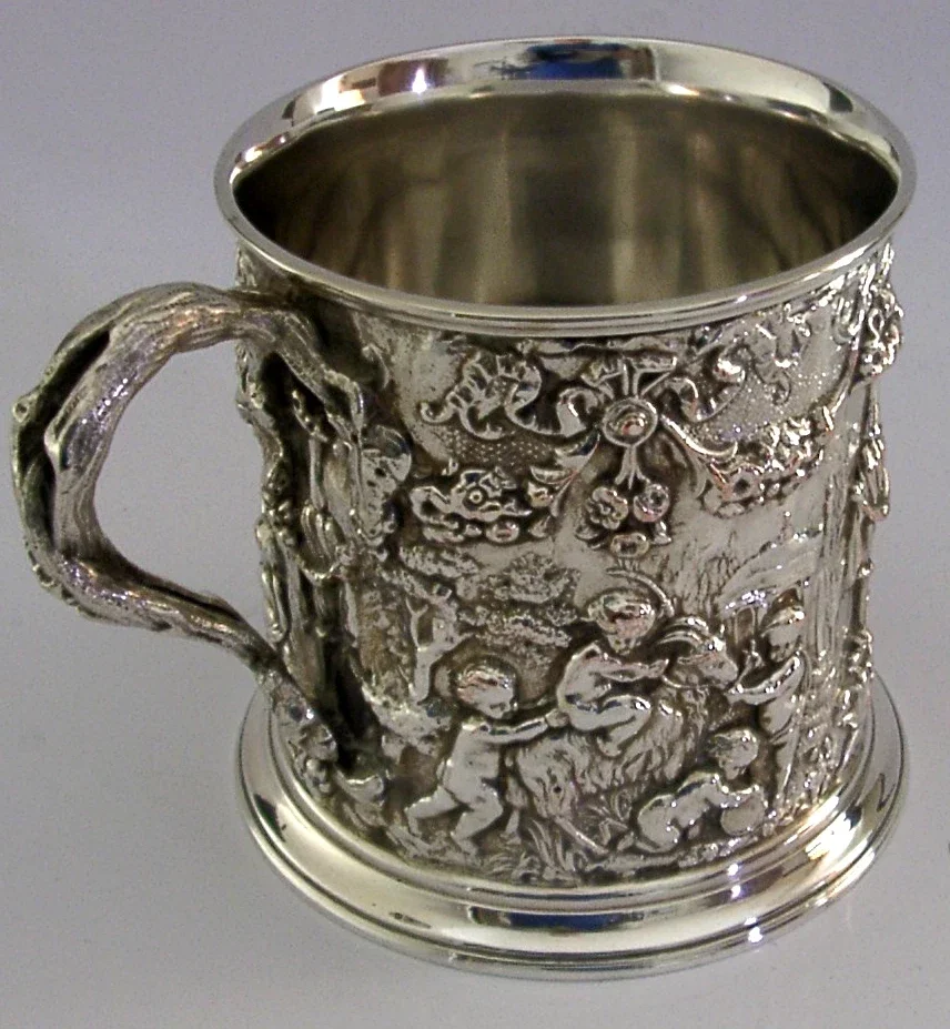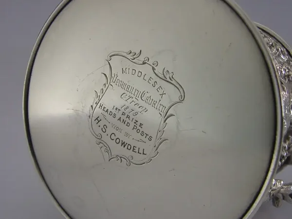 A very interesting English silver plated one pint tankard. It is has been made from old Sheffield plate, a thin plate of silver over copper and dates by it inscription to c1879. It has been decorated with cherubs and engraved to its base MIDDLESEX YEOMANRY CAVALRY C TROOOP 1879 1st PRIZE HEADS and POSTS H S COWDELL. Members of the Middlesex Yeomanry were involved with the Zulu Wars round this time. It is in good condition being free from dings splits distortions and repairs, there is wear to the outside with copper showing through and a patch of wear to the inside - see photos. It measures 4.5 inches tall by 6 inches wide including the handle and weighs 648 grams. A very interesting example.