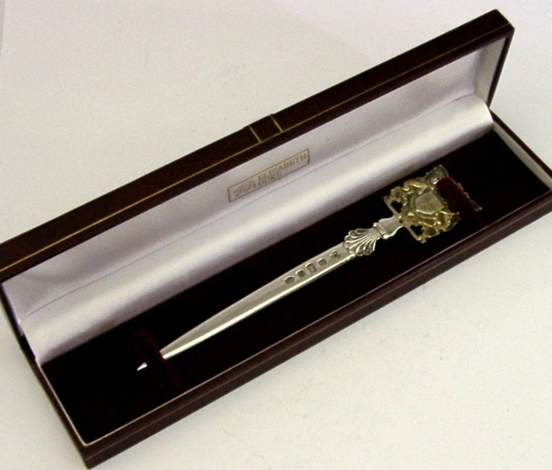 SUPERB SOLID STERLING SILVER LETTER ENVELOPE OPENER 1977 CASED ROYALTY 54g
