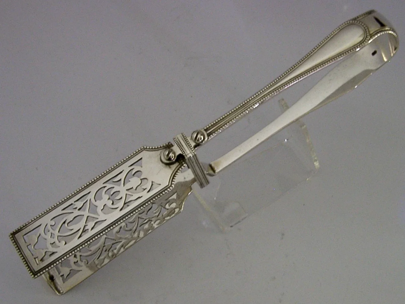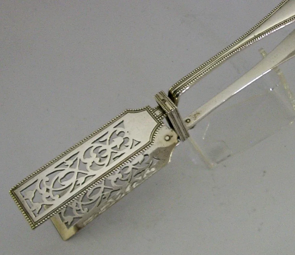 Very pretty English Victorian antique solid sterling silver asparagus, vegetable, or sandwich serving tongs. They are hallmarked for London 1865 with the maker being Chawner & Co (George William Adams). They have been superbly made being pierced and are highly sprung and in good working order. They are in superb condition being free from dings splits distortions and repairs. They measure 8 inches (20.2cm) long by 1 inch (2.6cm) wide and they weigh 124 grams. Very pretty examples.