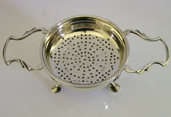 A super quality large English solid sterling silver tea strainer and drip bowl stand. It is hallmarked for Birmingham 1935 with the maker being JBC&SLtd. They have been superbly made and is in superb condition being free from splits distortions and repairs, a tiny faint dimple to the bowl side see final photo. The strainer measures over 5.25 inches (13.6cm) across including the handles and over 2.75 inches (7.2cm) across excluding them by 0.75 inch (1.9cm) deep and the bowl over 2.75 inches across by over 1.5 inches (4cm) tall and combined they weigh 100 grams. A very well made set.