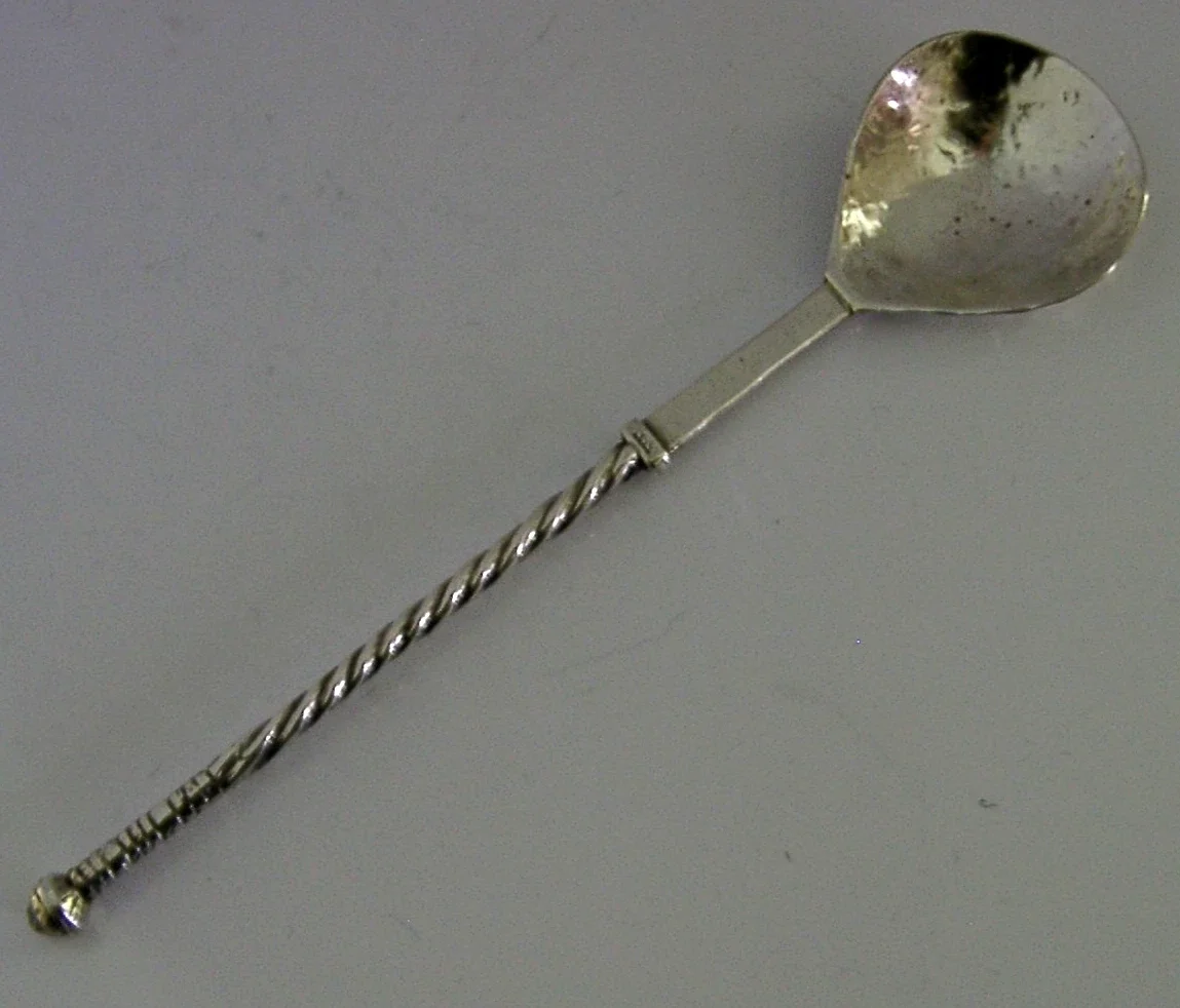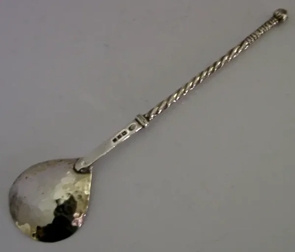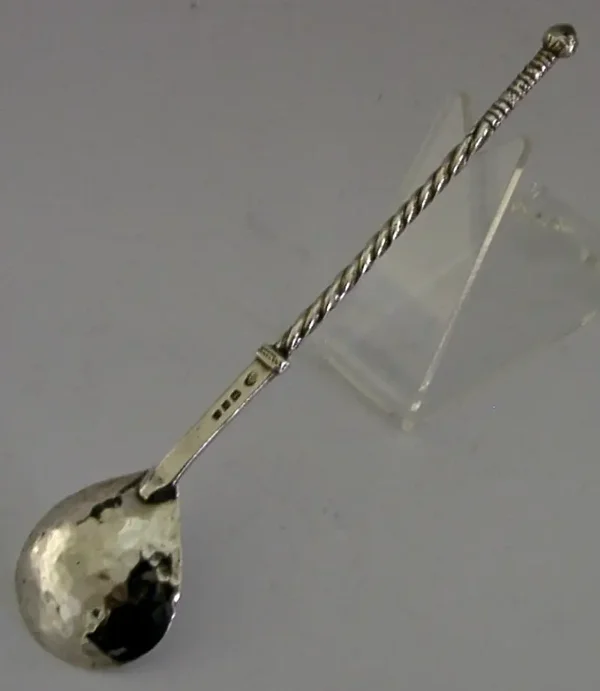 A beautiful handmade solid sterling silver Arts and Crafts spoon. It is hallmarked for London 1919 with the maker being Sandheim Brothers. It has been beautifully hand made having a planished bowl and spiral handle. It is in super condition being free from dings splits distortions and repairs. It measures approx. 6 inches (15.2cm) long by almost 1.5 inches (3.7cm) wide and weighs 18 grams. A beautifully made rare example.