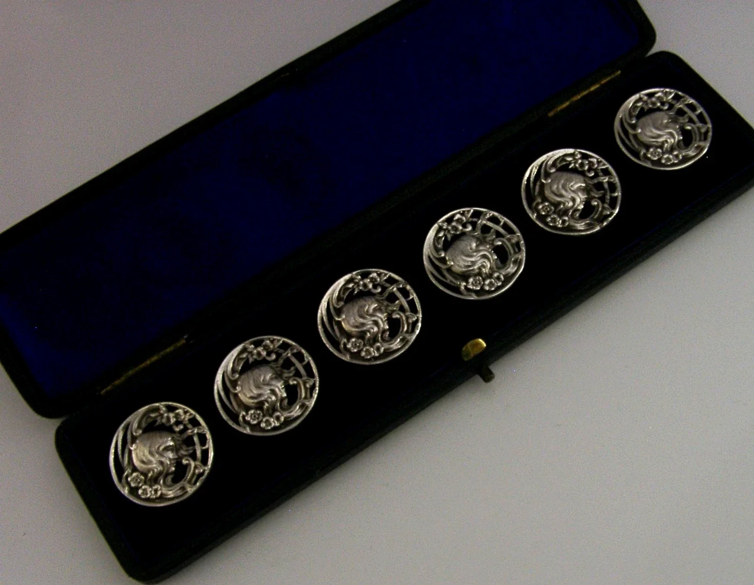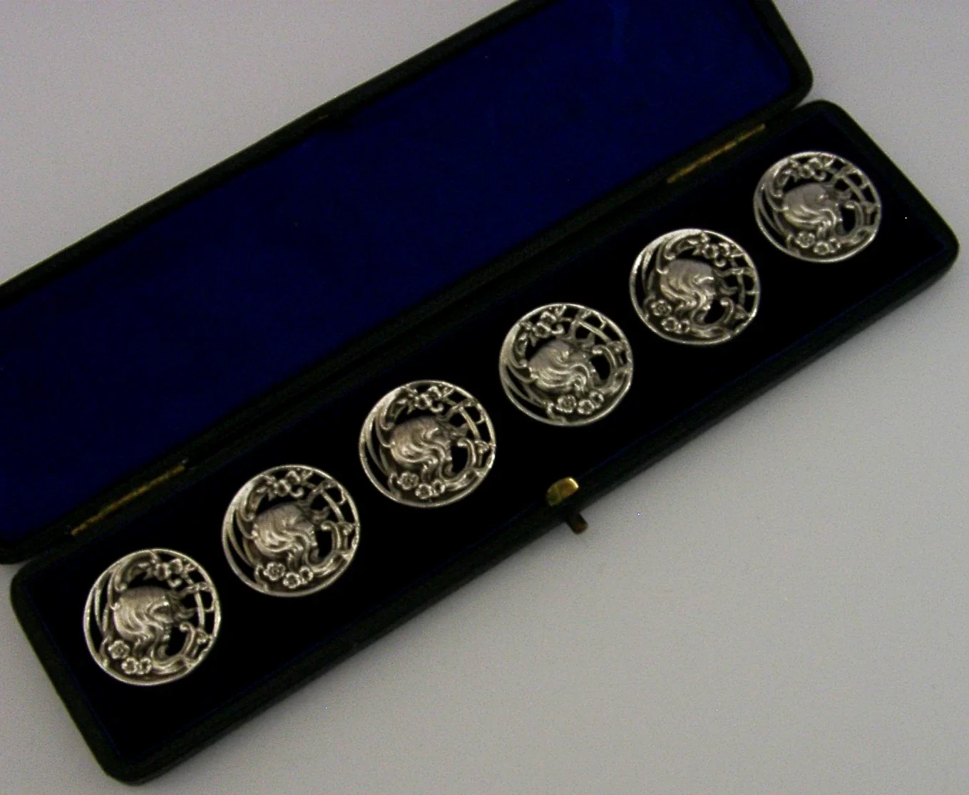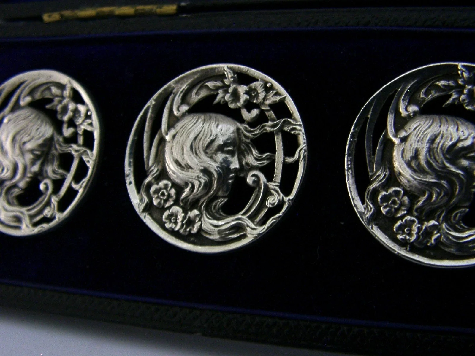 A beautiful cased set of six English antique solid sterling silver buttons. They are not hallmarked but test as sterling silver. They are all marked with the registration mark 352928 for 1900. They have been beautifully cast depicting maidens. They are all in superb condition being free from dings splits holes and repairs. They measure over 1 inch (2.8cm) across and have a combined weight of 44 grams excluding the case. A very beautiful very high quality set.