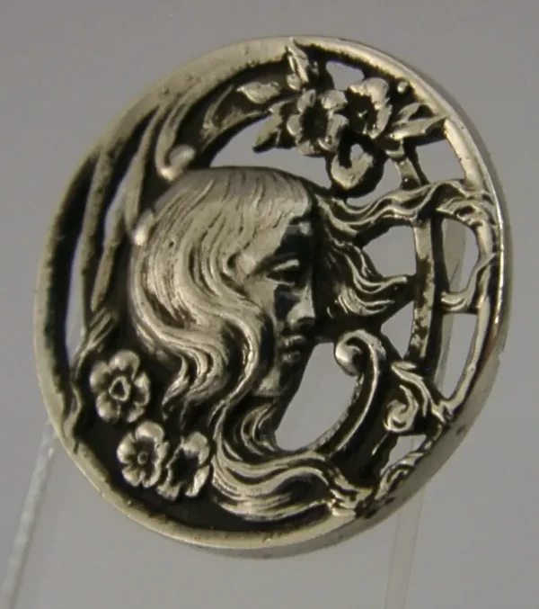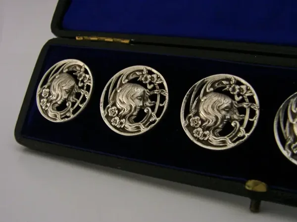 SIX ENGLISH STERLING SILVER ART NOUVEAU MAIDEN BUTTONS 1900 STUNNING CASED