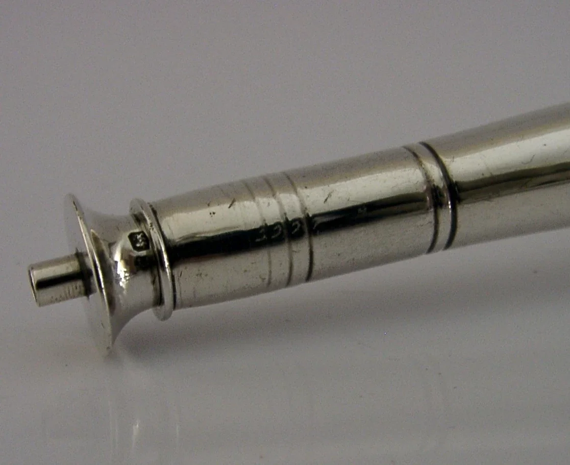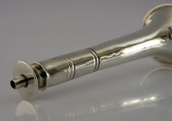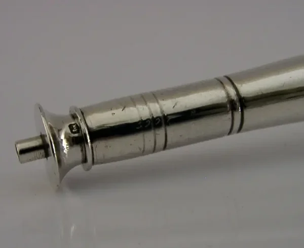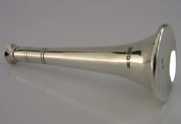 A nice quality English antique solid sterling silver table cigar lighter. It is hallmarked for Sheffield 1933 with the maker being Walker & Hal. It has been stylishly designed in the form of a hunting horn and would have been used by gents after dinner to light their cigars. It is in superb condition being free from dings, splits holes, tiny faint marks towards the base. It requires a cord wick but these can be bought on line. It measures approx. 4.5 inches (11.4cm) tall by over 1.5 inches (4cm) wide and weighs 82 grams. A superbly made high quality piece.