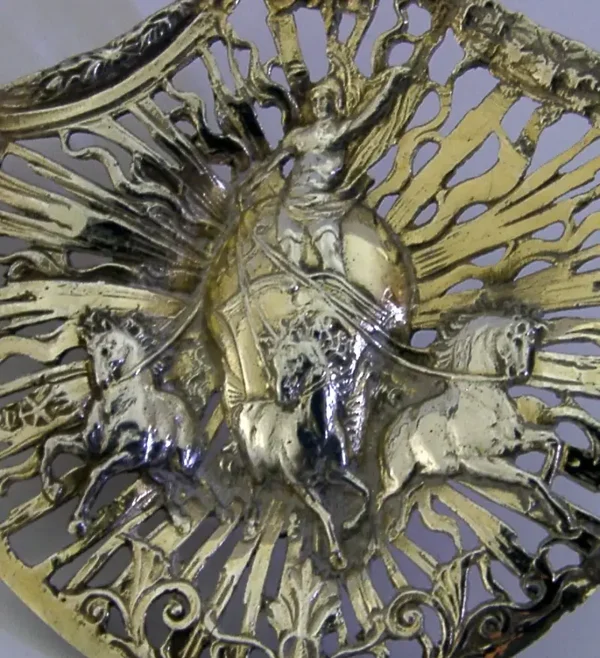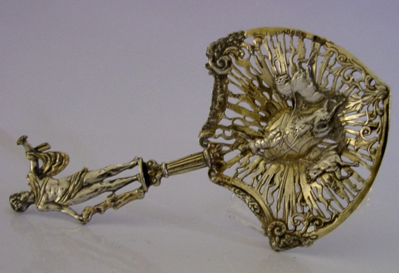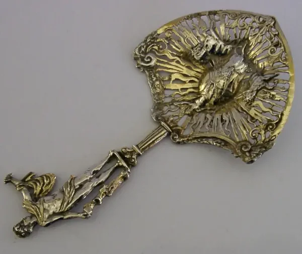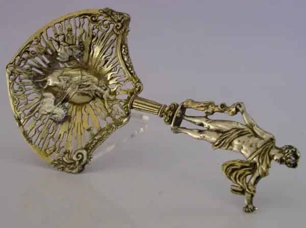 A rare German Hanau antique solid sterling silver bonbon spoon. It is hallmarked with English import marks for London 1897, the importers mark of B Muller & Son (Berthold Muller) along with the German Hanau marks. It has been nicely designed having its terminal in the form of a clasical figure (Hercules?) and the bowl pierced and depicting a chariot (Boudica?). It is in super condition being free from dings splits and repairs. It measures over 6 inches (15.5cm) long by 3.25 inches (8.3cm) wide and weighs 46 grams. A very interesting example.