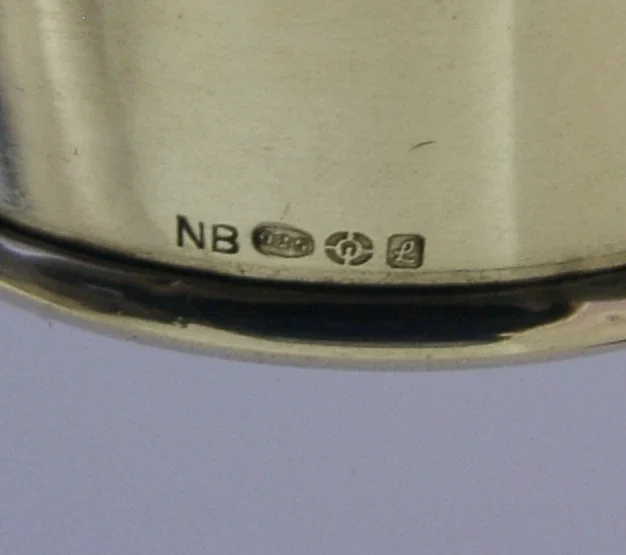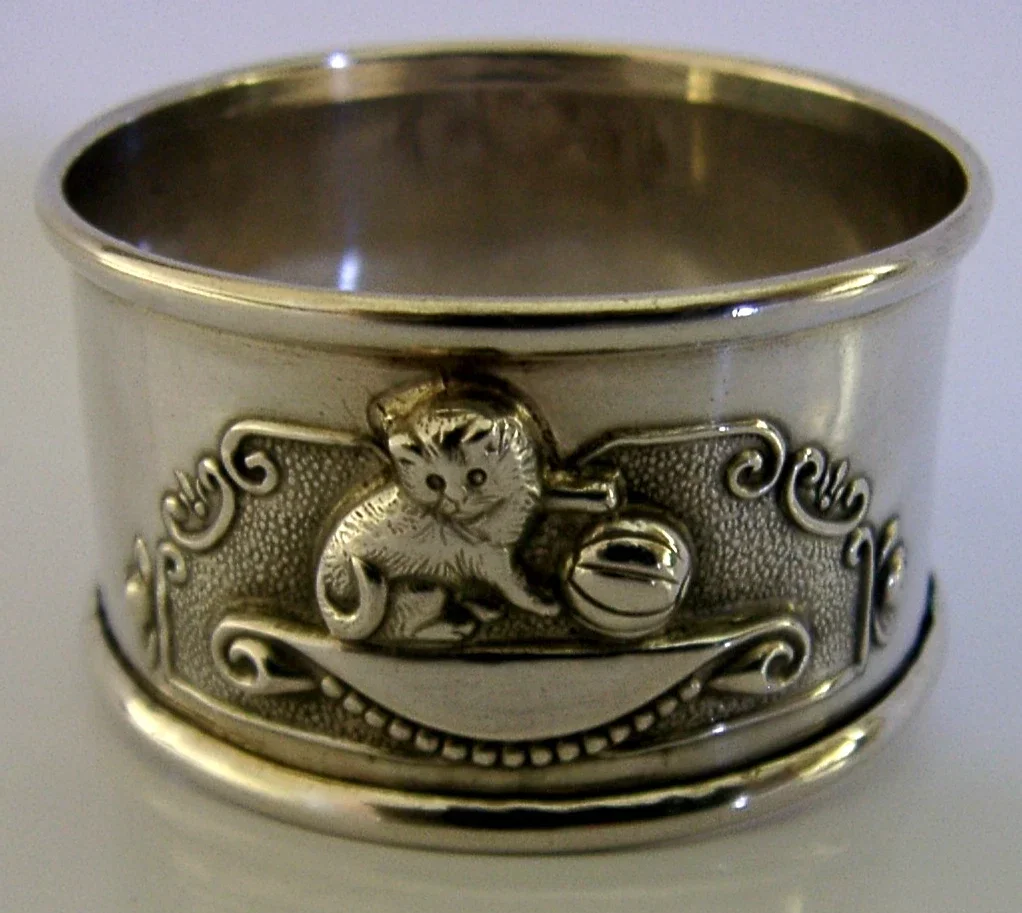 A lovely English import solid sterling silver napkin ring. It is hallmarked with English import marks for London 1985 and the importers mark being NB. It has been beautifully made having the embossed image of a kitten cat playing with a ball. It is in super condition being free from dings splits and repairs. It measures over 1.5 inches (4.1cm) wide by over 0.75 inch (2.4cm) tall and weighs 10 grams. A nice example.
