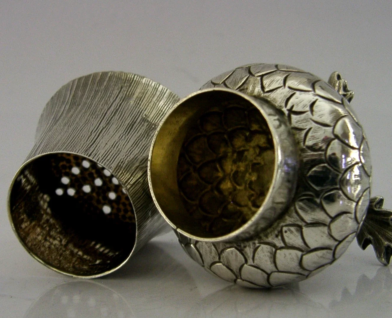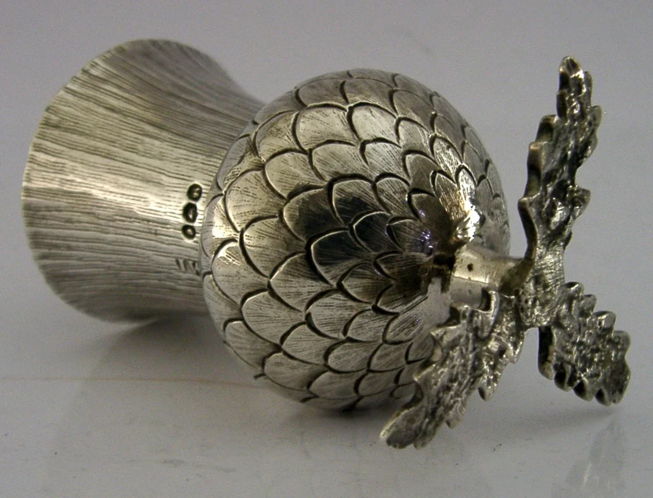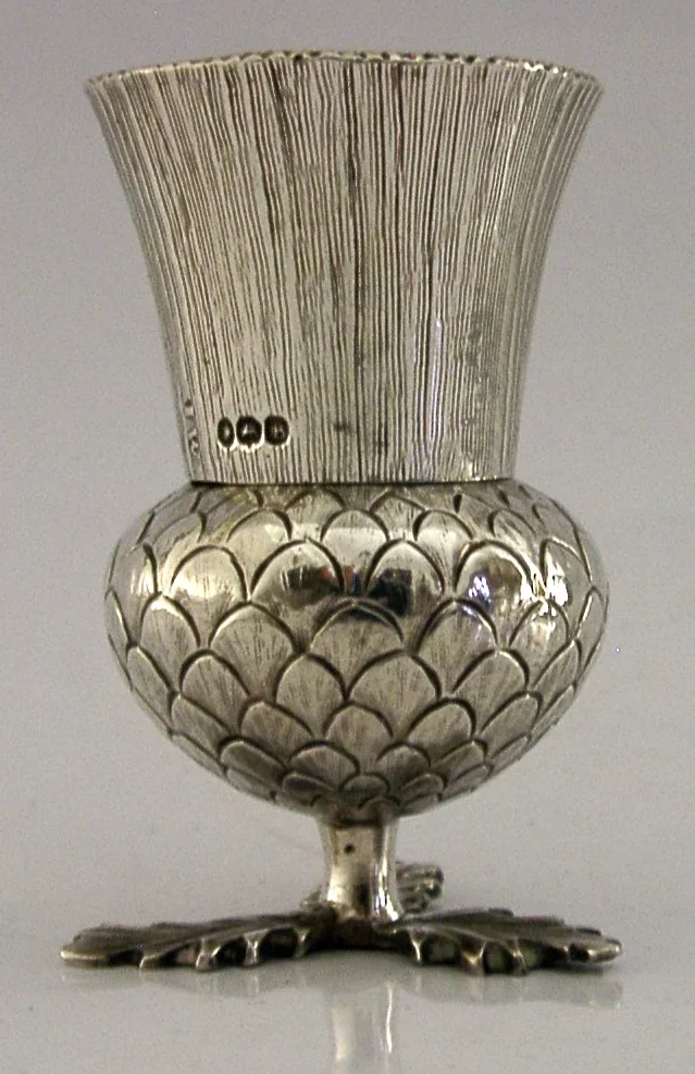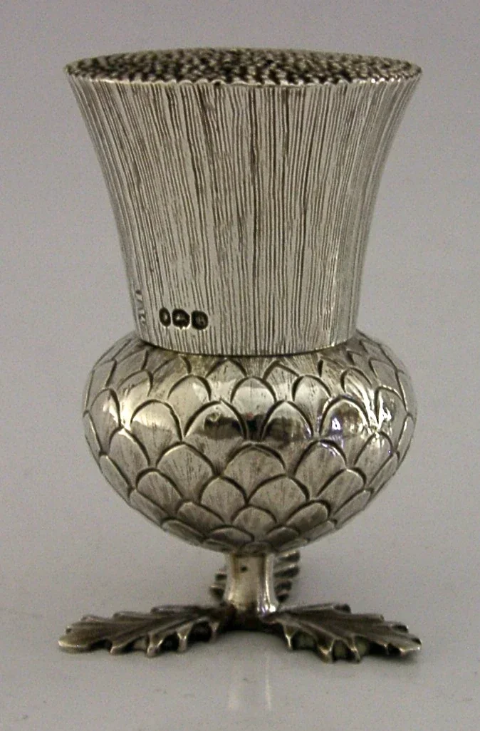 A rare English William IV antique solid sterling silver pounce pot. It is hallmarked for London 1837 with the maker being John Wellby. It has been superbly designed being made in the form of a Scottish thistle. It measures approx. 3 inches (7.6cm) tall by 1.75 inches (4.5cm) across and weighs 66 grams. A very impressive piece.