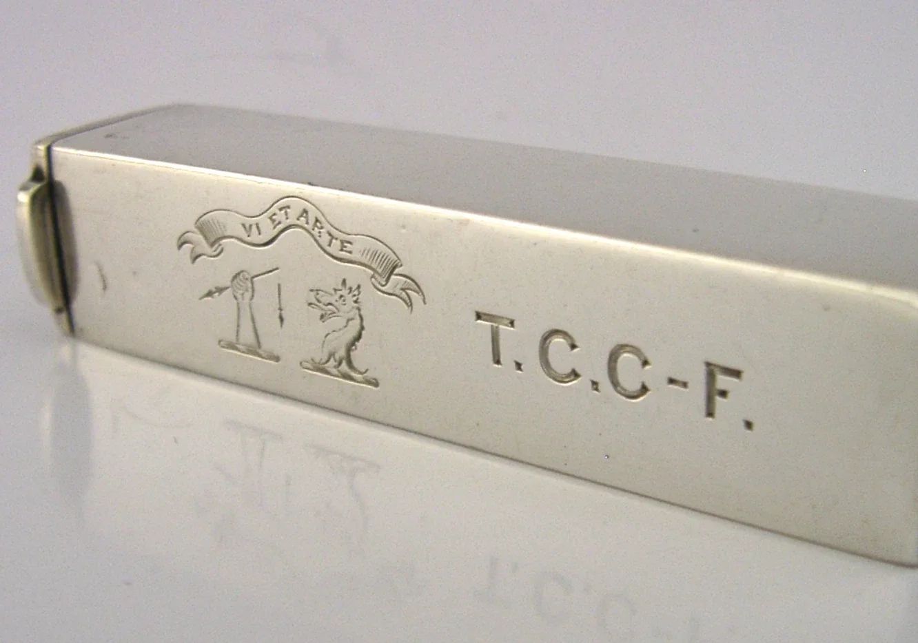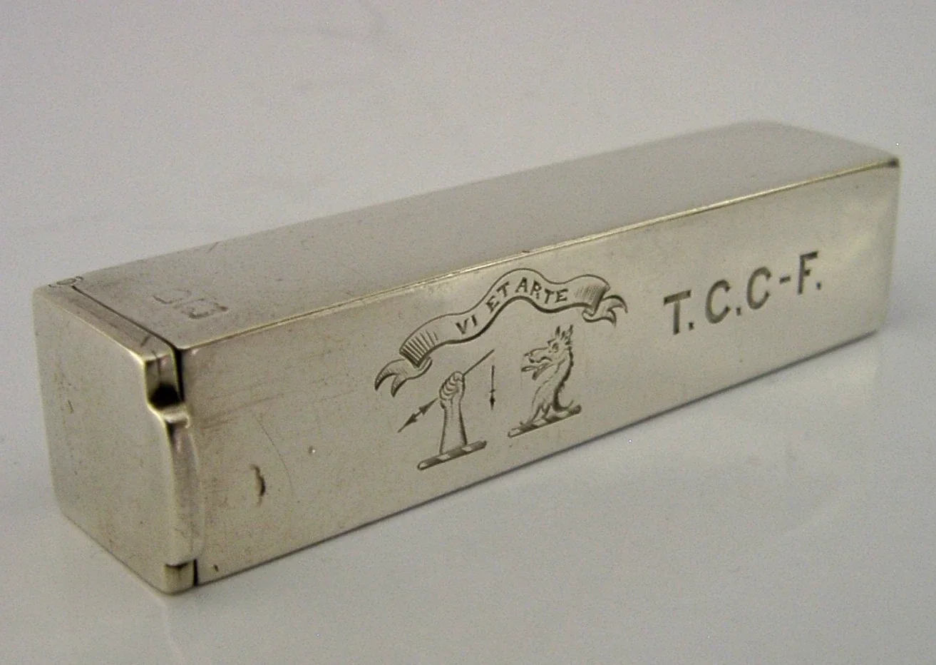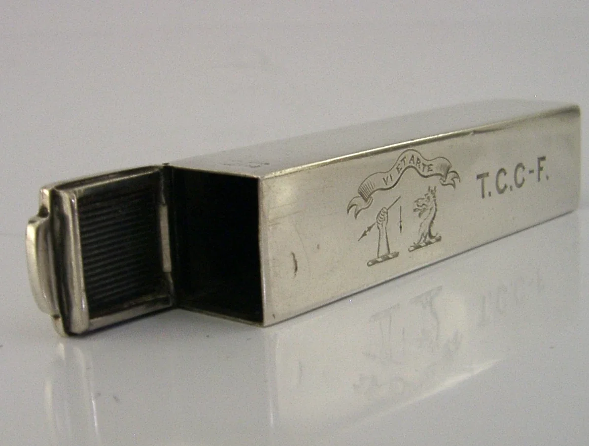 A superb rare English antique solid sterling silver sealing wax holder and combination vesta case. It is hallmarked for London with the date letter being rubbed. I would date it to c1880-1900. It has been superbly designed and has been engraved with a motto VI ET ARTE and the double family crest Cross-Ferguson (possibly marking the coming together of the families via marriage). The square open end holds a sealing wax stick the other end holds matches. It is in superb condition being free from dings splits holes and repairs, just the odd faint mark. It measures approx. 3 inches (7cm) long by 0.75 inch (1.9cm) square and weighs 32 grams. A very unusual example.