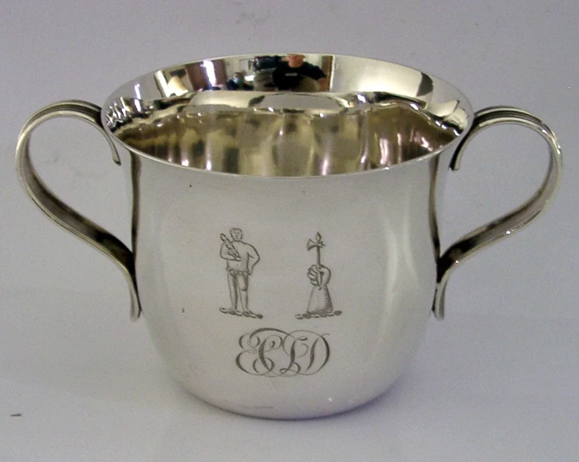 A beautiful English Edwardian antique solid sterling silver porringer cup or bowl. It is hallmarked for London 1905 with the maker being Edward Barnard & Sons Ltd. It has been superbly made having two ornate handles and has been engraved with the crests of the Coney family and Drake family, most likely a marriage gift. It is in superb condition, having no dings splits or repairs. It measures approx. 5.5 inches (14cm) across including the handles and almost 3.5 inches (8.8cm) excluding them by 2.75 inches (7cm) tall and weighs 136 grams. A superbly designed clean example.