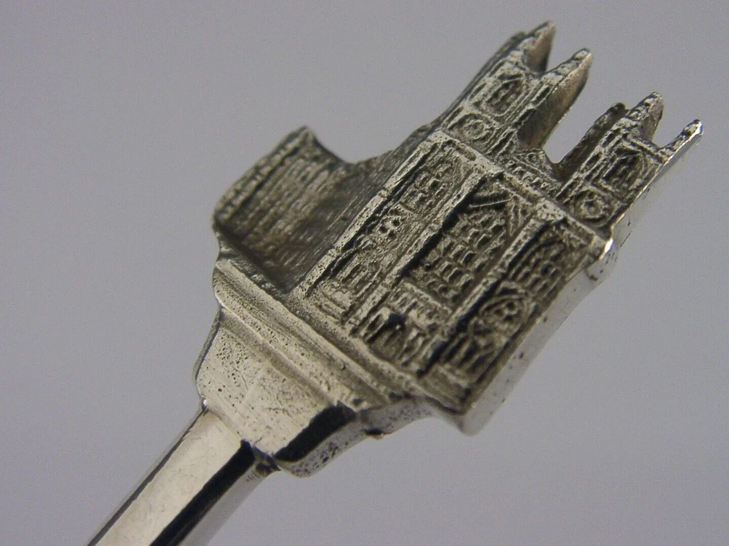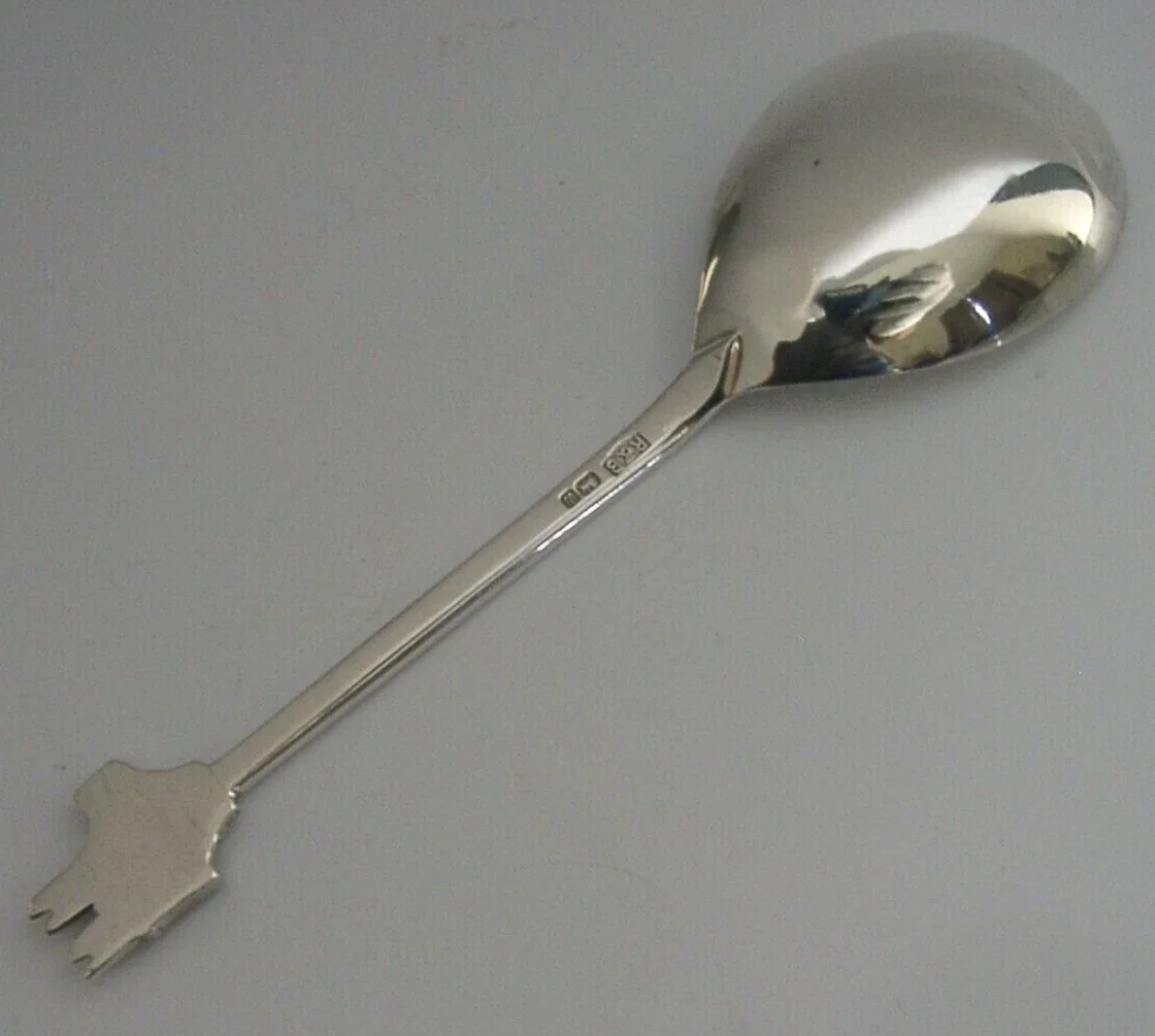 A very interesting English solid sterling silver souvenir jam spoon. It is hallmarked for Sheffield 1978 with the maker’s marks being that of Roberts & Belk Ltd. It has been superbly designed with the terminal being in the form of Westminster Abbey used for the Royal Coronations. It is in superb condition being free from dings splits distortions and repairs. It measures approx. 5.25 inches (13.2cm) long by 1.5 inches (3.8cm) wide and weighs 31 grams. A very interesting piece.