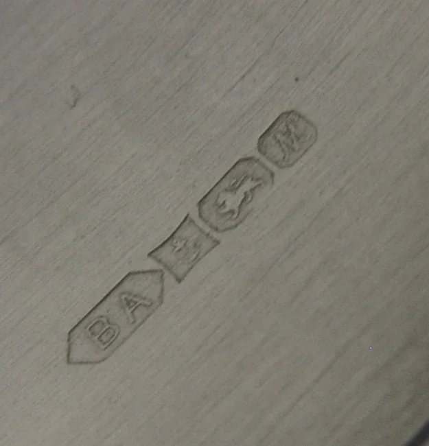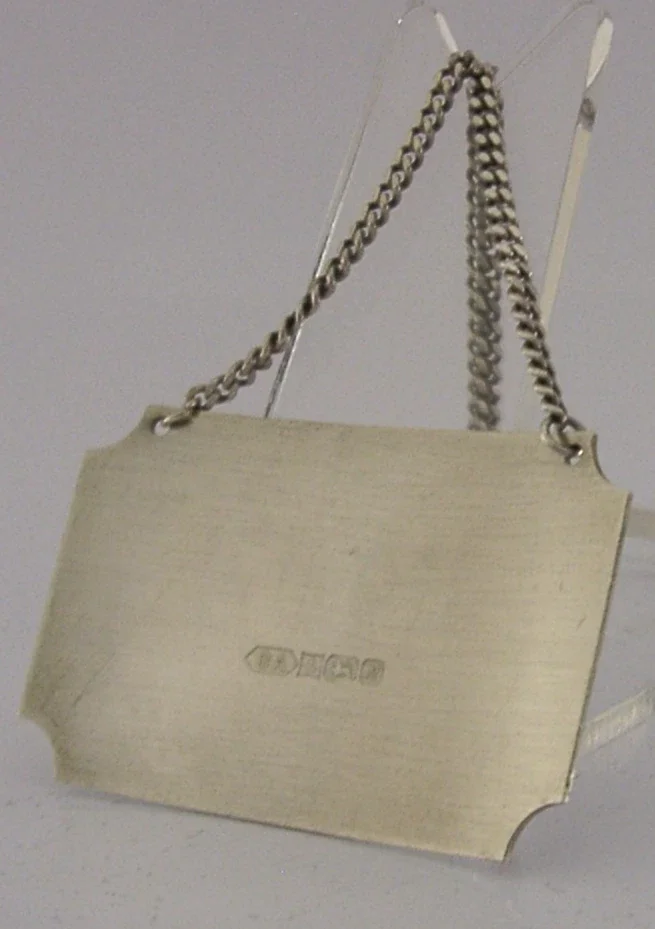A very nice quality English solid sterling silver Rye decanter label. It is hallmarked for Birmingham 1986 with the maker being that of British Airways. It has been made as a souvenir of Concorde. It is in super condition being free from dings splits and repairs. It measures approx. 2 inches (5cm) by 1.25 inches (3.3cm) tall excluding the chain and weighs complete with the chain 14 grams. A very nicely made clean piece.
