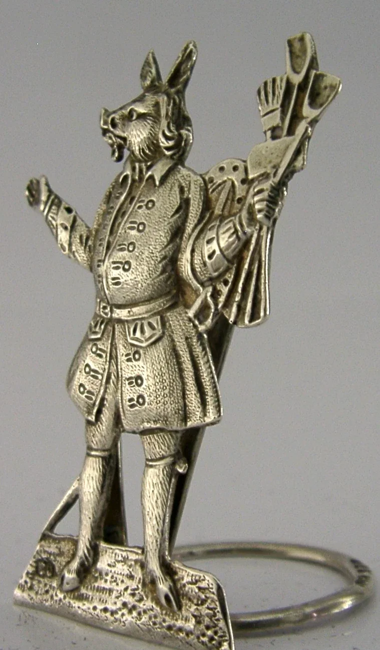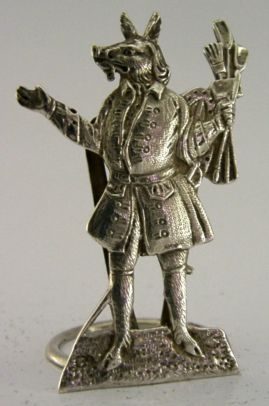 A rare English Edwardian antique solid sterling silver menu holder. It is hallmarked for London 1907 with the maker being F J Ross & Sons (Frederick James Ross). It has been superbly designed being in the form of Winchesters Trusty Servant. It is in super condition being free from dings splits and repairs. It measures over 2.25 inches (6cm) tall by 1.25 inches (3.1cm) across the base and weighs 18 grams. A very nice quality piece.