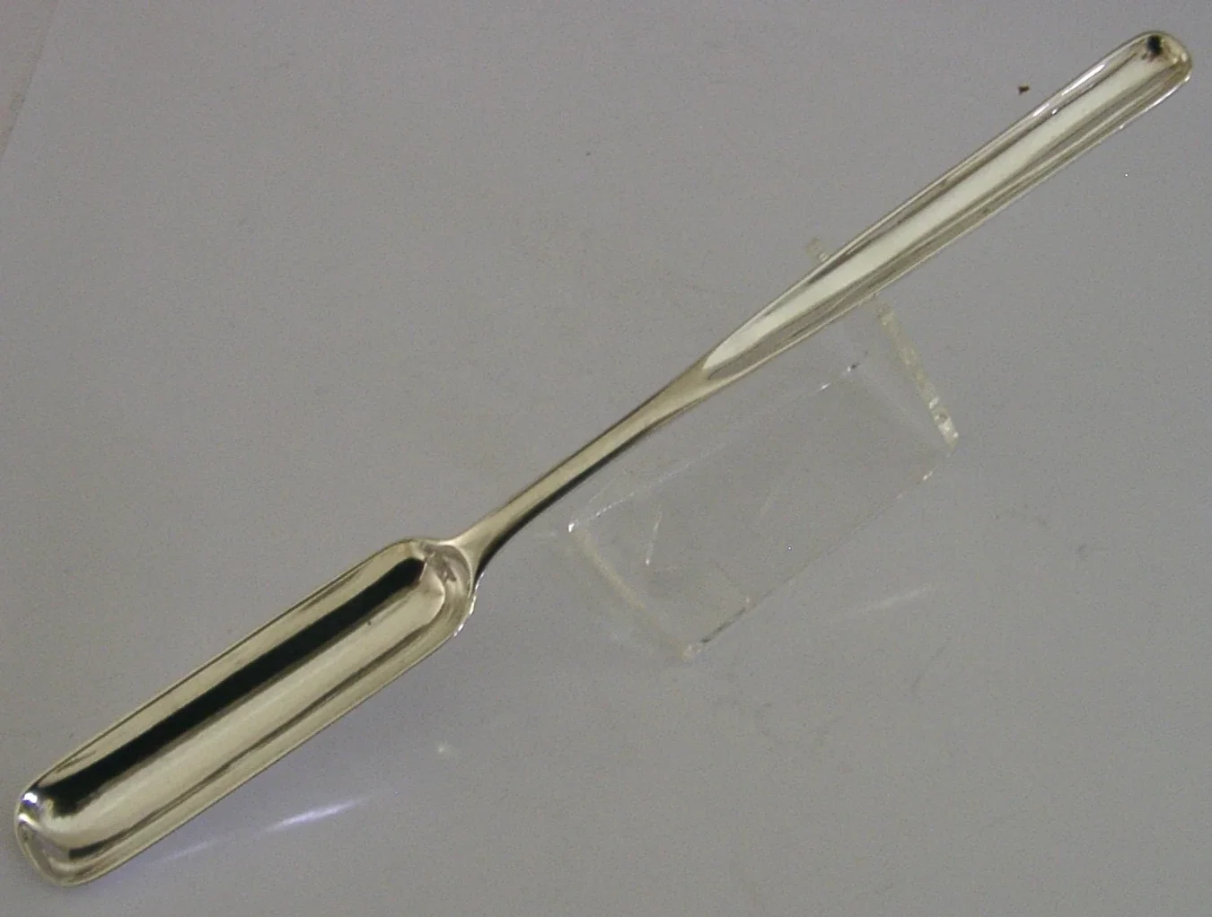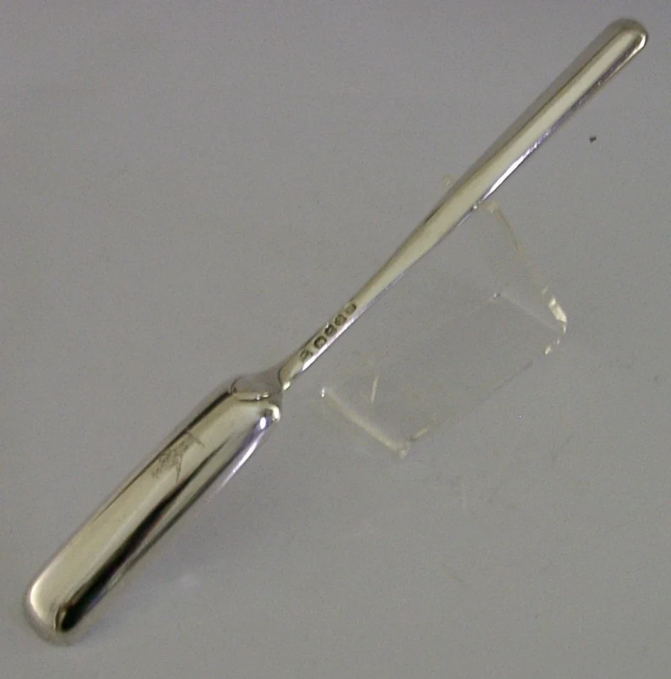 A rare English Georgian antique solid sterling silver marrow scoop. It is hallmarked for London 1810 with the makers mark being difficult to decipher. It has been superbly designed being engraved with the crest used by the Clown, Cloun and Delamaine Families. It is in super condition having no dings splits distortions or repairs. It measures approx. 9.25 inches (23.2cm) long by over 0.75 inch (2.3cm) wide and weighs 48 grams. A very high quality interesting early piece.