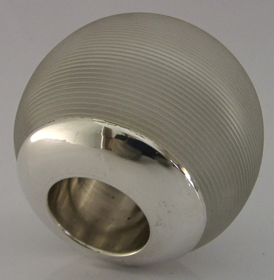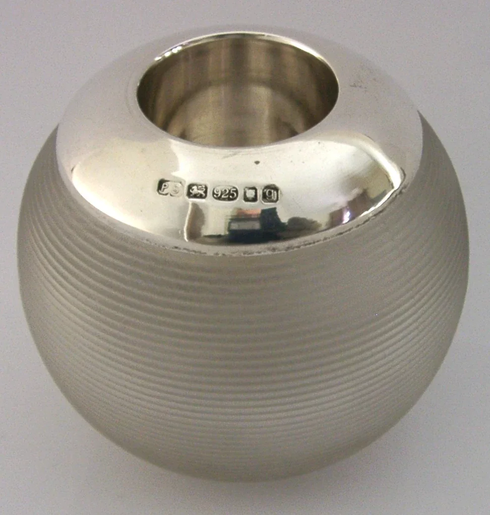 A nice clean English solid sterling silver rimmed frosted glass match striker. It is hallmarked for London 2006 with the maker being Practical Silverware. It has been superbly made and is in superb condition being free from splits chips cracks and repairs. It measures approx. 3 inches (7.6cm) across by 2.75 inches (7cm) tall and weighs 174 grams. A very well made example.