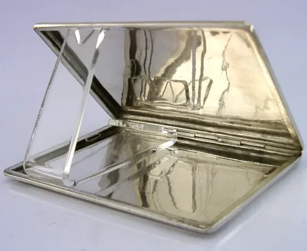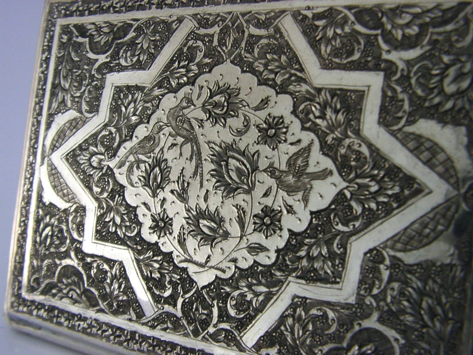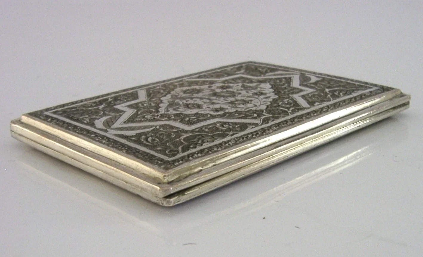 A beautiful solid silver Persian cigarette case. It is hallmarked with Persian silver marks and tests as high grade silver. I would date it to c1920-1940. It has been beautifully hand made being engraved and chased. It is in superb condition being free from dings splits holes and repairs, gilded inside. It is sprung so automatically closes. It measures over 4.25 inches (11.2cm) long by almost 3.25 inches (8cm) wide and weighs 134 grams. A superbly designed beautiful example.