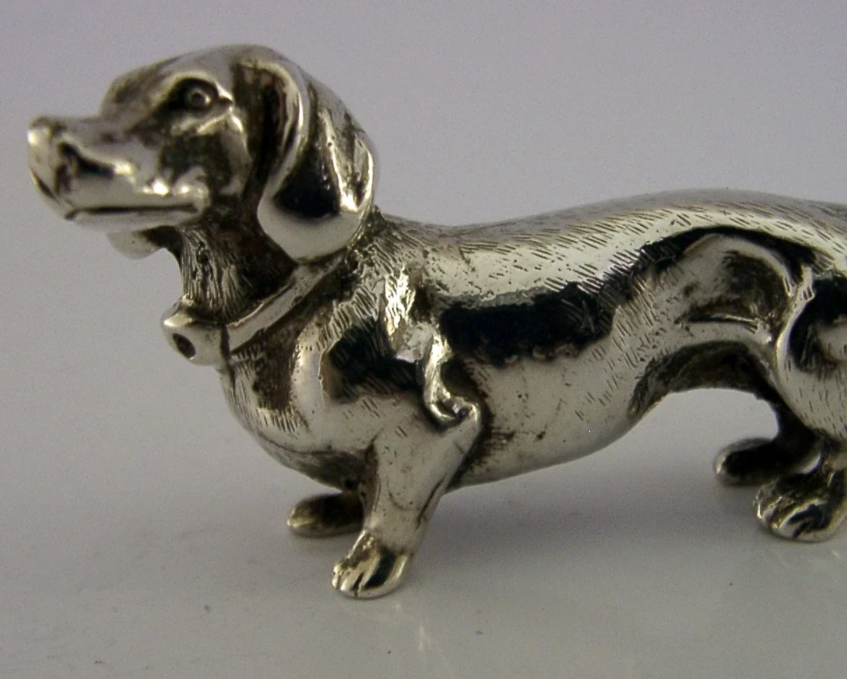 A superbly modelled decent sized solid sterling silver animal figure. It is hallmarked for Chester 1939 with the maker being CS FS. Its been beautifully modelled being finely cast in the form of a Dachshund dog. It is in super condition being free from dings splits and repairs. It measures approx. 2.75 inches (6.6cm) long by 1.25 inches tall and weighs 41 grams. A very well designed high quality example.