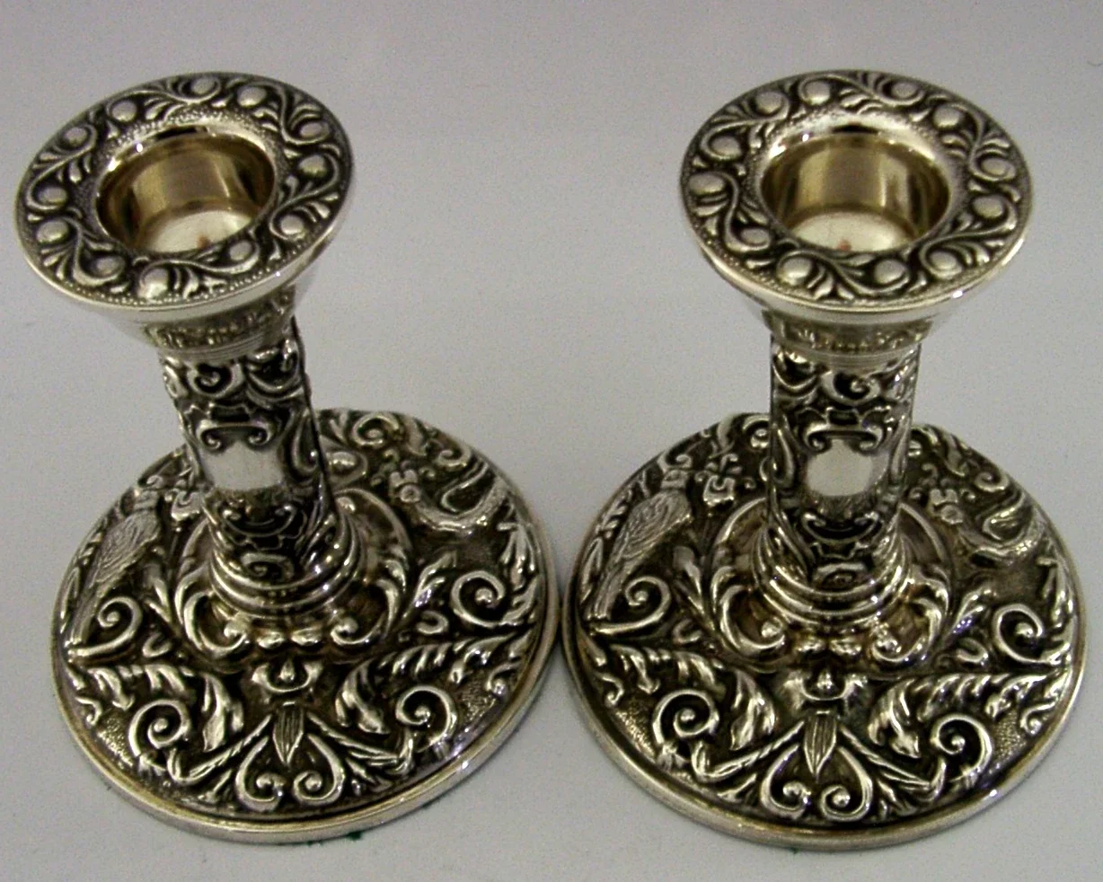 PRETTY ENGLISH STERLING SILVER CANDLESTICKS 1983 GREEN MAN BIRDS