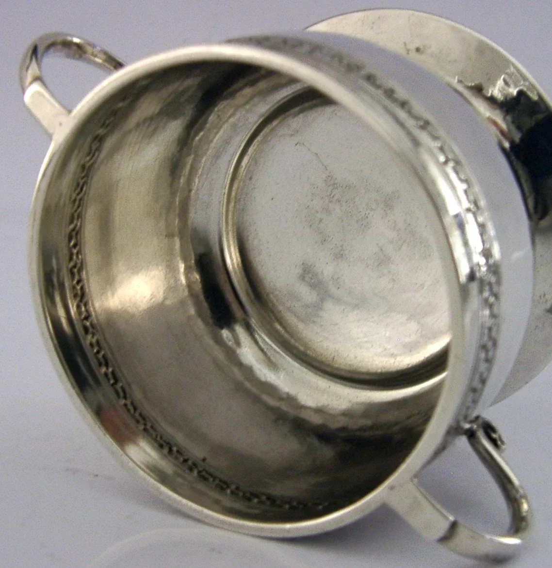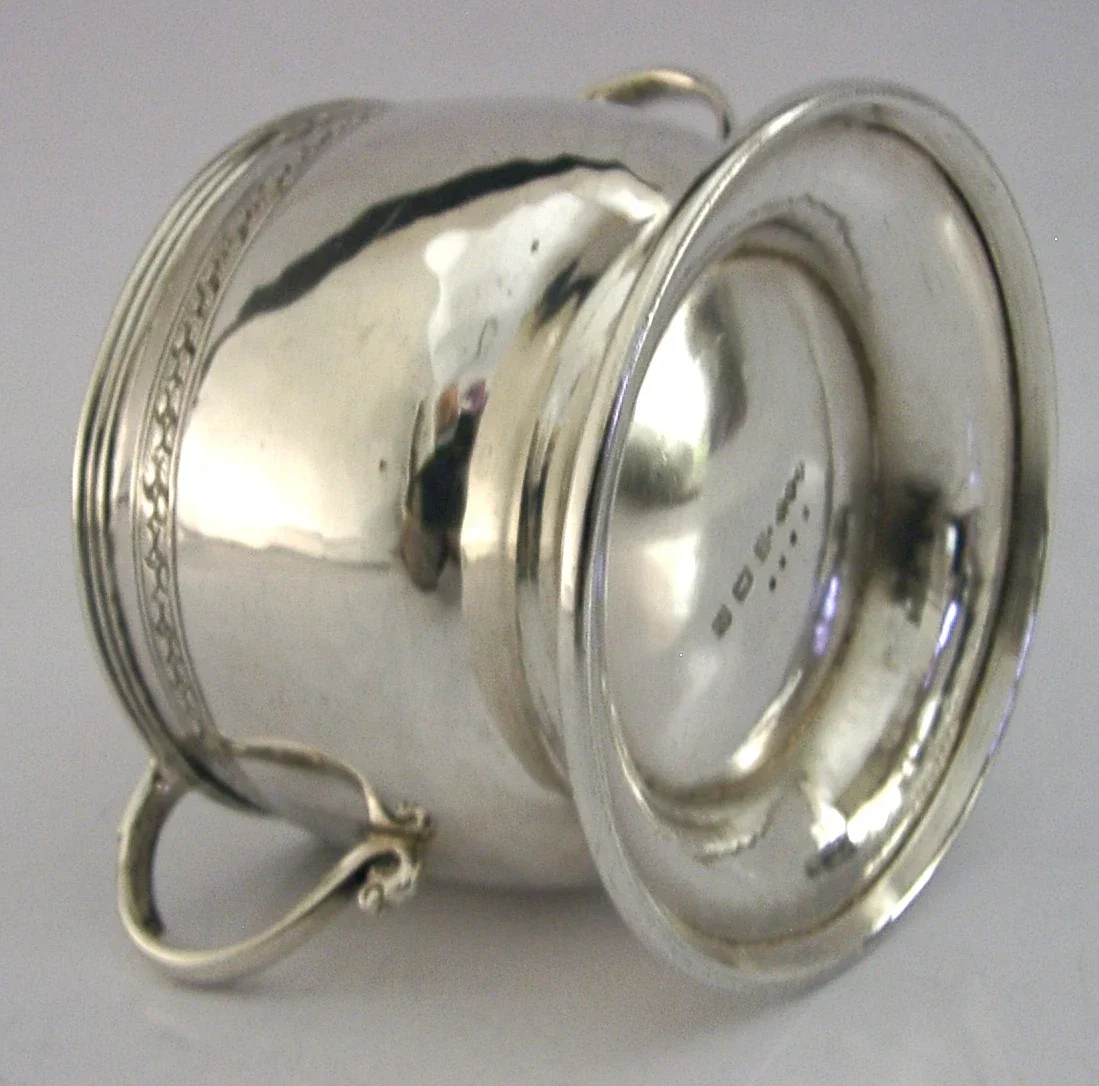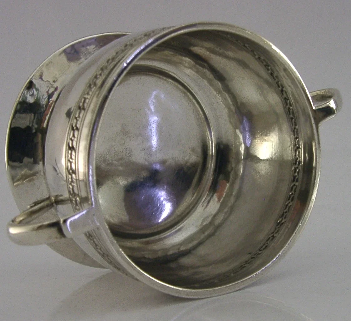 A beautiful hand made English antique solid sterling silver Arts & Crafts bowl. It is hallmarked for Birmingham 1922 with the maker being Liberty and Co. It has been beautifully design having two handles and has been hand planished. It is in superb condition having no dings splits or repairs. It measures approx. 4 inches (10.2cm) across including the handles by 2.5 inches (6.4cm) excluding them by 2 inches (5.1cm) tall and weighs 78 grams. A stunning example.