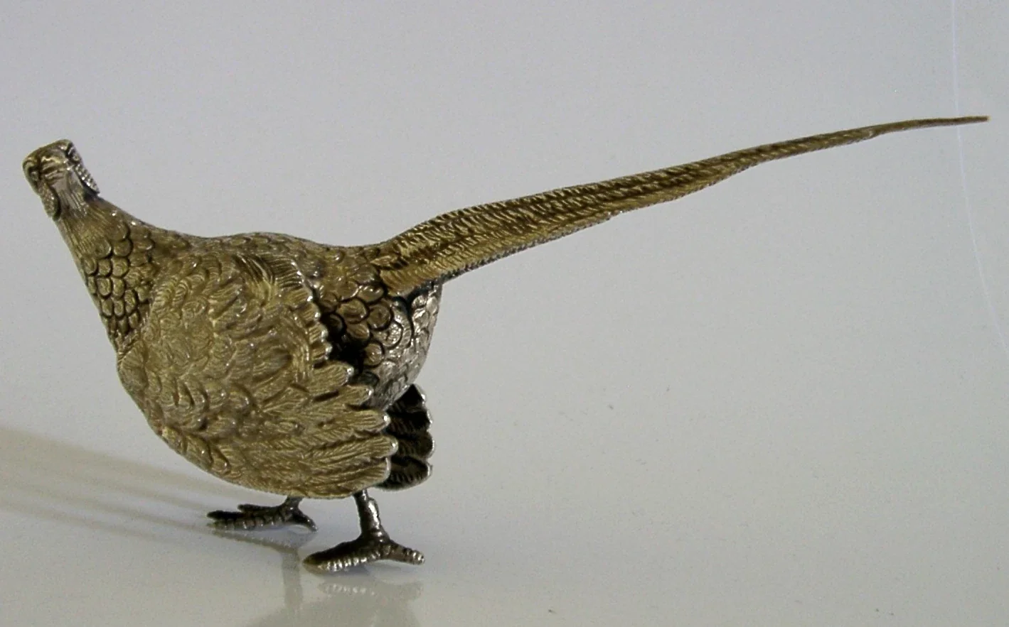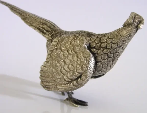 A superbly modelled good sized sterling silver desk or table bird figure. It is hallmarked for Sheffield 1998 with the maker marks being C J Vander. It has been beautifully modelled being finely hollow cast in the form of a male pheasant bird. It is in super condition being free from dings splits and repairs. It measures approx. 6 inches (15.5cm) long beak to tail by 2.5 inches (6.3cm) tall to the top of its head and weighs 200 grams (all silver weight, i.e. it is not filled). A very well designed very high quality example.