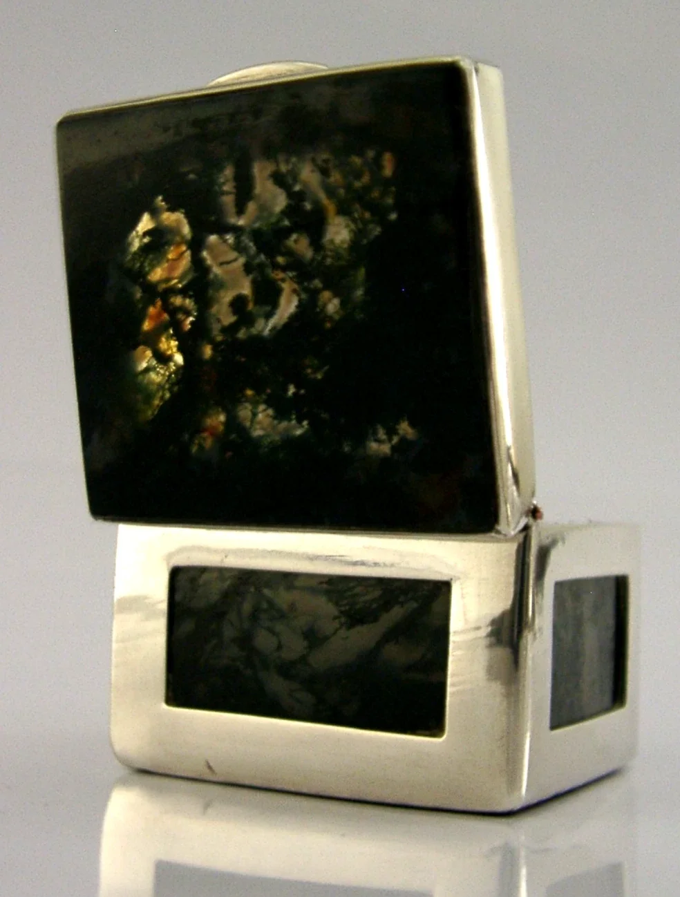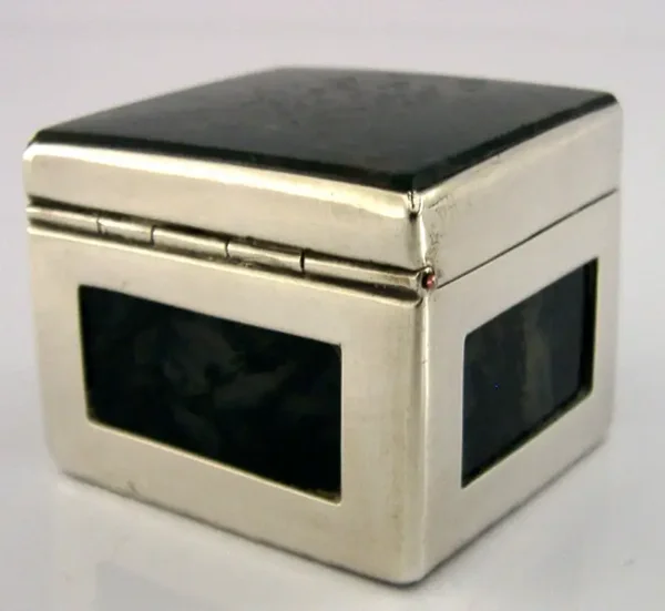 A beautiful hand made Indian solid silver and moss agate box. It is unmarked but tests as high grade silver. I would date it to c1920. It has been superbly designed being hand made and is in super condition being free from dings splits holes and repairs, no chips or cracks to the agate. It measures over 1.5 inches (4.2cm) square by almost 1.5 inches (3.6cm) tall and weighs 78 grams. A stunning example.