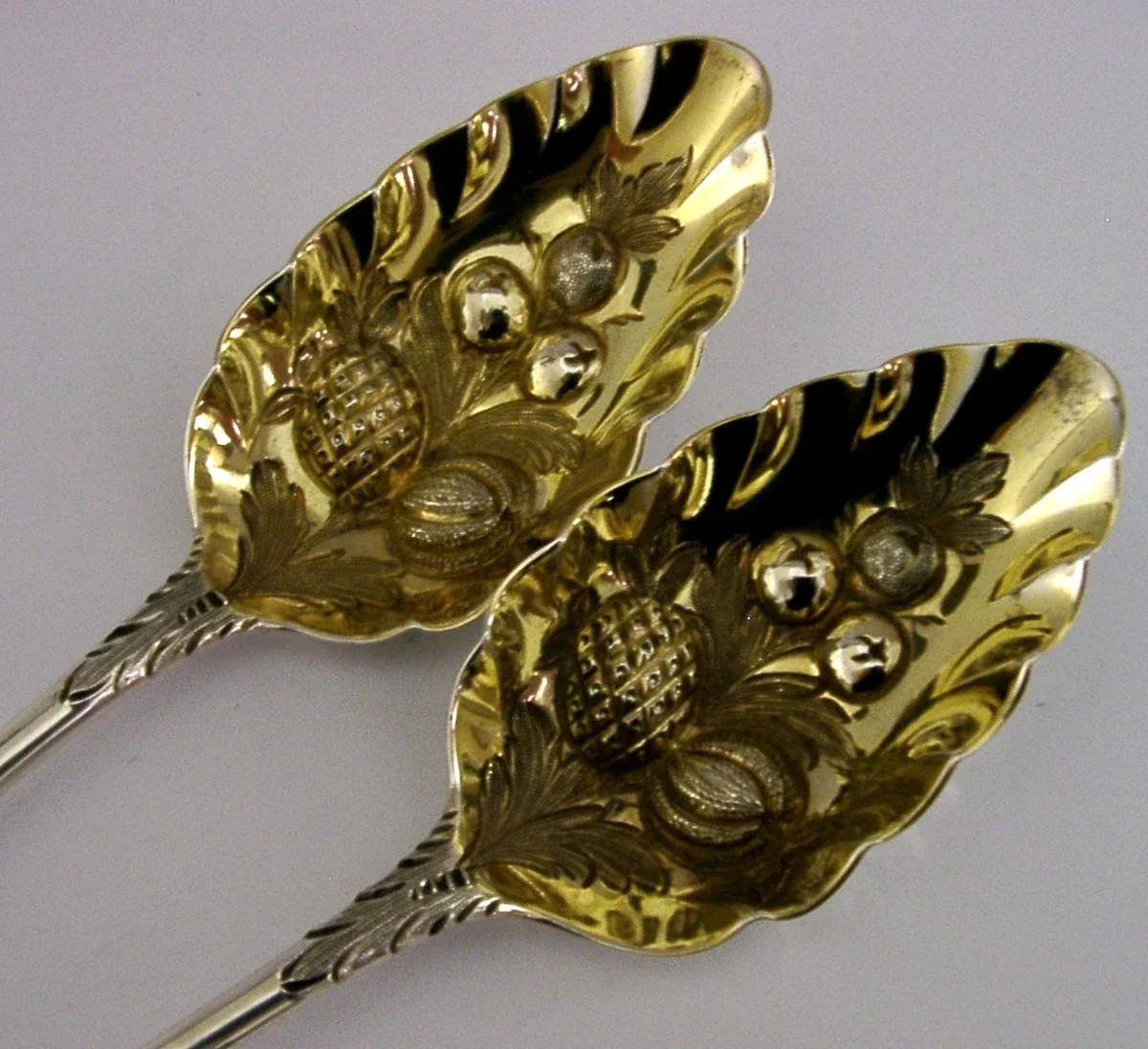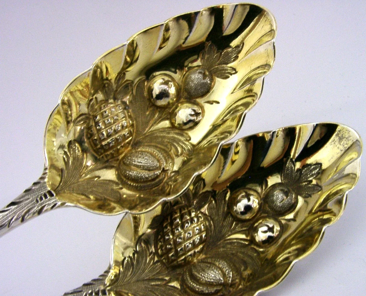 A stunning pair of English Georgian antique solid sterling silver berry serving spoons. They are hallmarked for London 1803 with the maker mark being Edward Lees. They have been superbly made being embossed with berries and engraved with the family crest used by the French family. They are in superb condition being free from dings splits distortions and repairs. They measure approx. 8.75 inches (22.2cm) long by over 1.75 inches (4.7cm) wide and they have a combined weight of 104 grams. A super quality early pair.