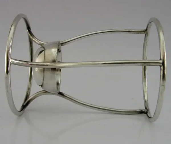A rare very nicely designed English silver plated Hamilton bottle stand. It is marked WH&S BP for William Hutton and Sons of Sheffield, the BP means Britannia Plate (a form of silver plate) it dates to c1890-1910. It is in super condition being free from dings splits and repairs, the silver plate is in superb condition. It measures 4.5 inches (11.3cms) tall by 3.5 inches wide and weighs 124 grams. A very nice piece.