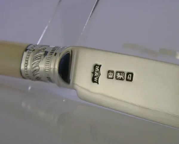 A superb English Edwardian antique solid sterling silver cheese knife. It is hallmarked for Sheffield 1908 with the maker being Mappin & Webb Ltd. It has been superbly designed having a bone handle. It is in superb condition being free from dings splits and repairs. It measures approx. 8.25 inches (21.2cm) long by over 1 inch (2.9cm) wide across the handle and weighs 44 grams. A beautifully made example.