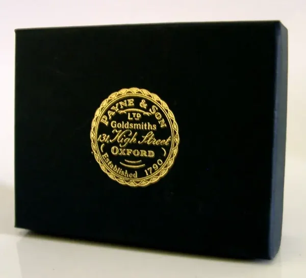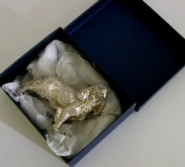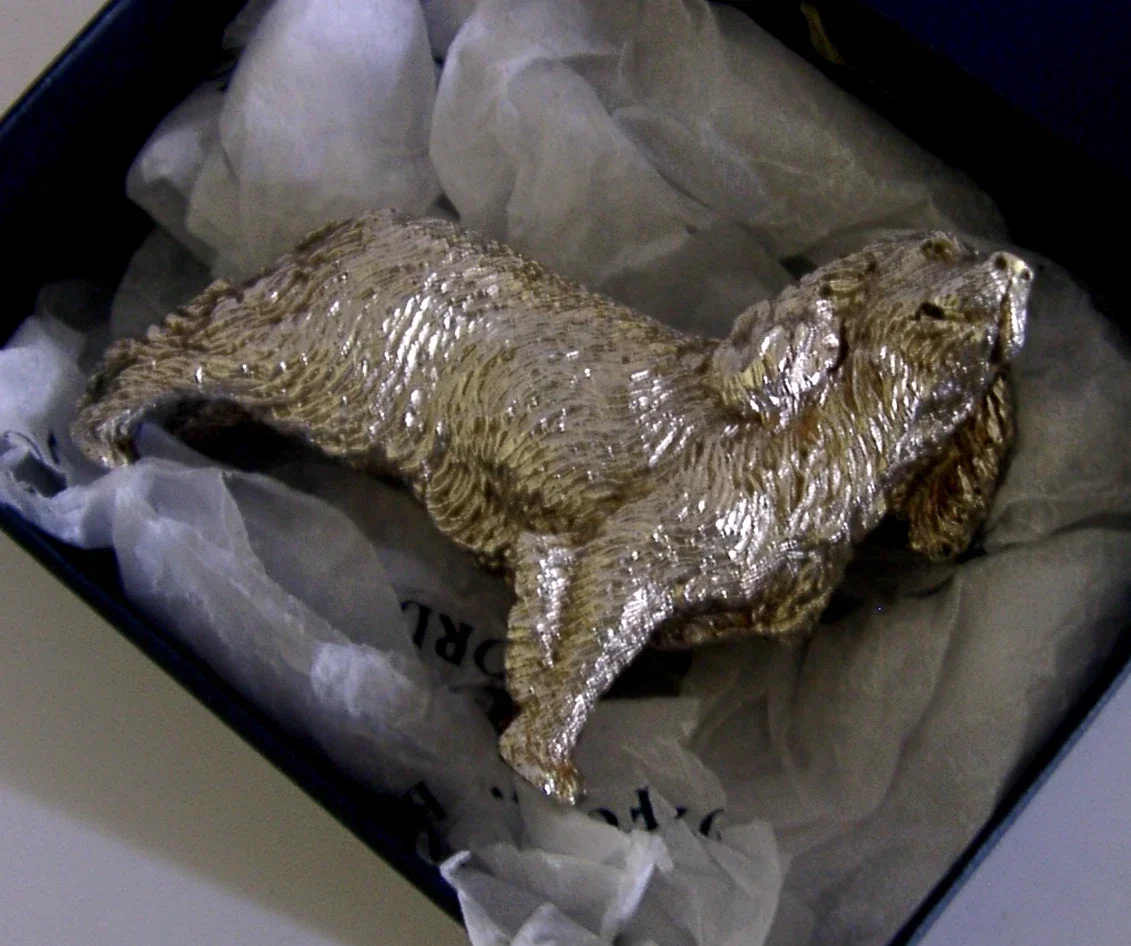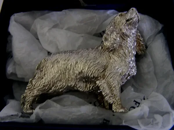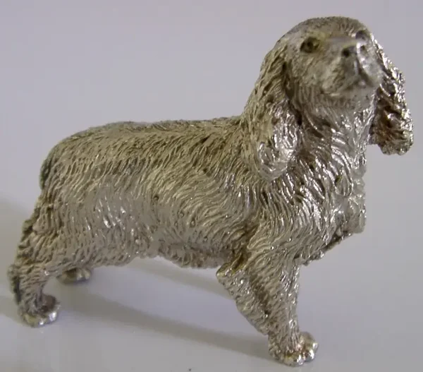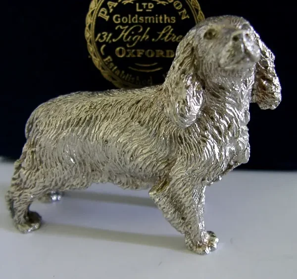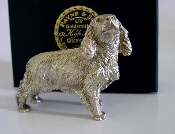 A top quality decent sized English sterling silver dog figure. It is hallmarked for London 1978 with the maker being IP for Ian Powsey a highly regarded animal specialist. It has been retailed by Payne and Son of Oxford. It appears to be a spaniel (Cocker of Springer). It is in super condition being free from dings splits and repairs, still boxed. It measures approx. 2.5 inches (6.6cm) long by 2 inches tall and weighs 88 grams excluding the box (not filled or weighted). A top quality piece.