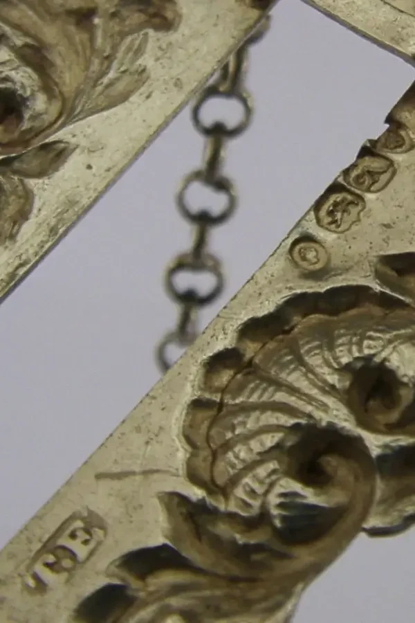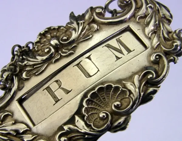 A rare English William IV antique solid sterling silver Rum wine decanter label. It is hallmarked for Birmingham 1836 with the maker being Thomas Edwards. It has been superbly designed allowing the drink's name to be slid out and replaced. It is in superb condition being free from dings splits holes and repairs. It measures approx. 2.5 inches (6.4cm) wide by 1.5 inches (3.8cm) tall excluding the chain and complete with its chain weighs 18 grams. A very nicely designed piece.