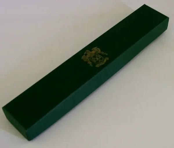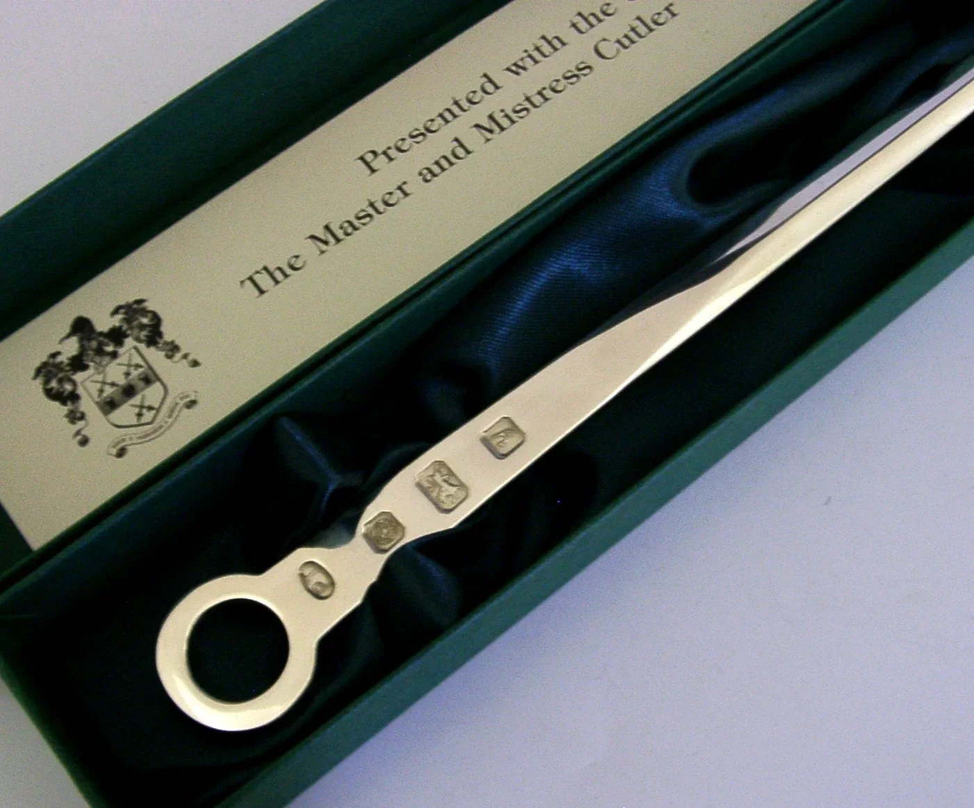 A super quality boxed English solid sterling silver letter opener. It is hallmarked for Sheffield 1998 with the makers mark being PT which is the Master Cutler's initials of Paul Tear. Paul Tear was a prominent Sheffield industrialist who served as the 359th Master Cutler in 1997–1998, notable as the first "manufacturing cutler" in over 40 years to hold the office. It has been superbly made being a replica of a Georgian meat skewer. It is in super condition being free from dings splits distortions and repairs, no inscriptions, the box its also great. It measures approx. 8.25 inches (21cm) long by over 0.75 inch (2.4cm) wide and weighs 58 grams excluding the box. A very well designed piece.